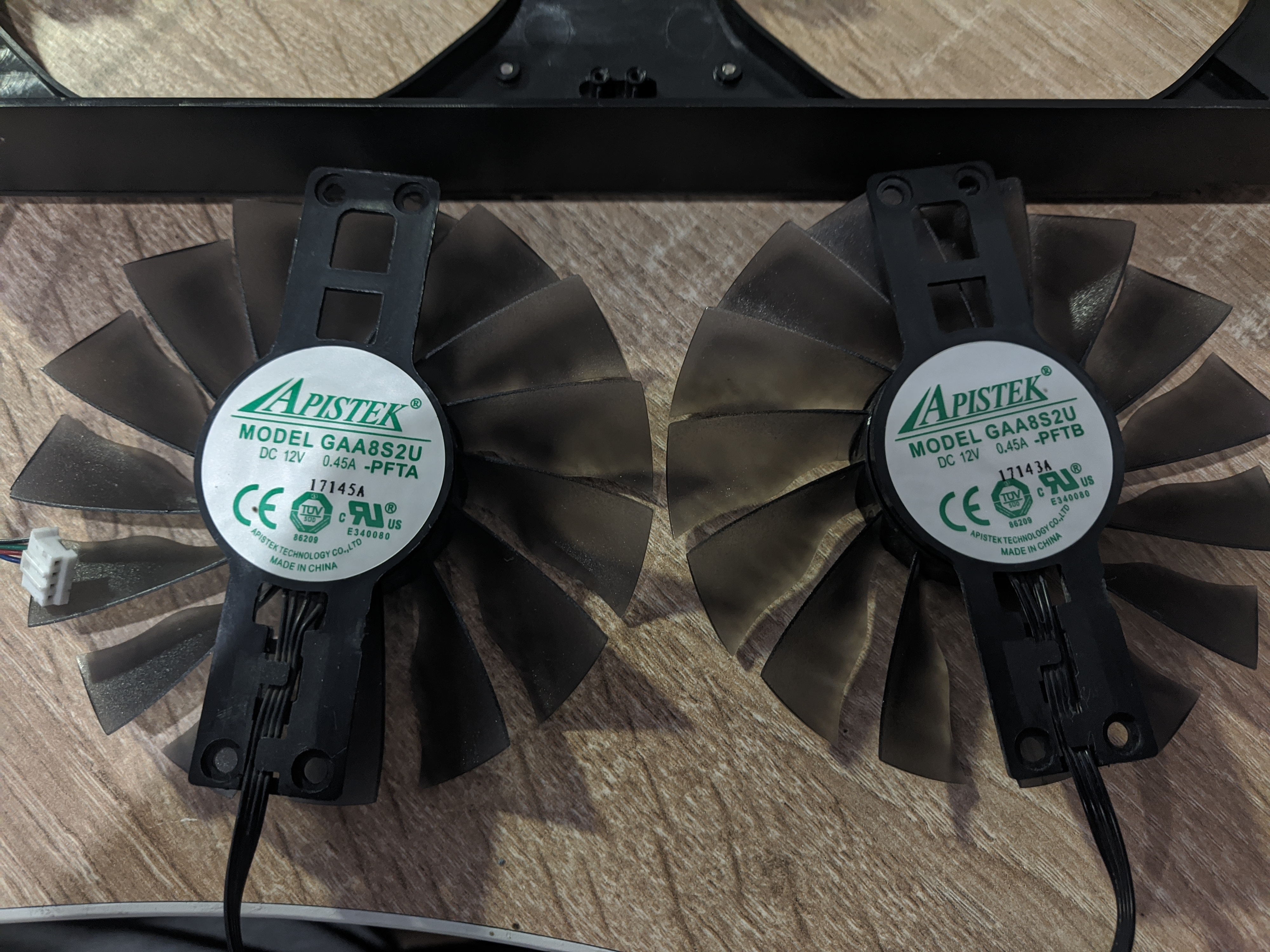 Материал - металл в перемешку с нечто похожим на пластик. По общим ощущениям, будто это акрилловый или асбестовый материал. Имеет так же термопрокладки с противоположной стороны зоны VRM. Отдирать их не стал, они в прекрасном состоянии. Толщина их 1.5 мм. 3. Вентиляторы Apistek model GAA8S2U DC12V 0.45A, стоят в среднем 700 р. за шт.