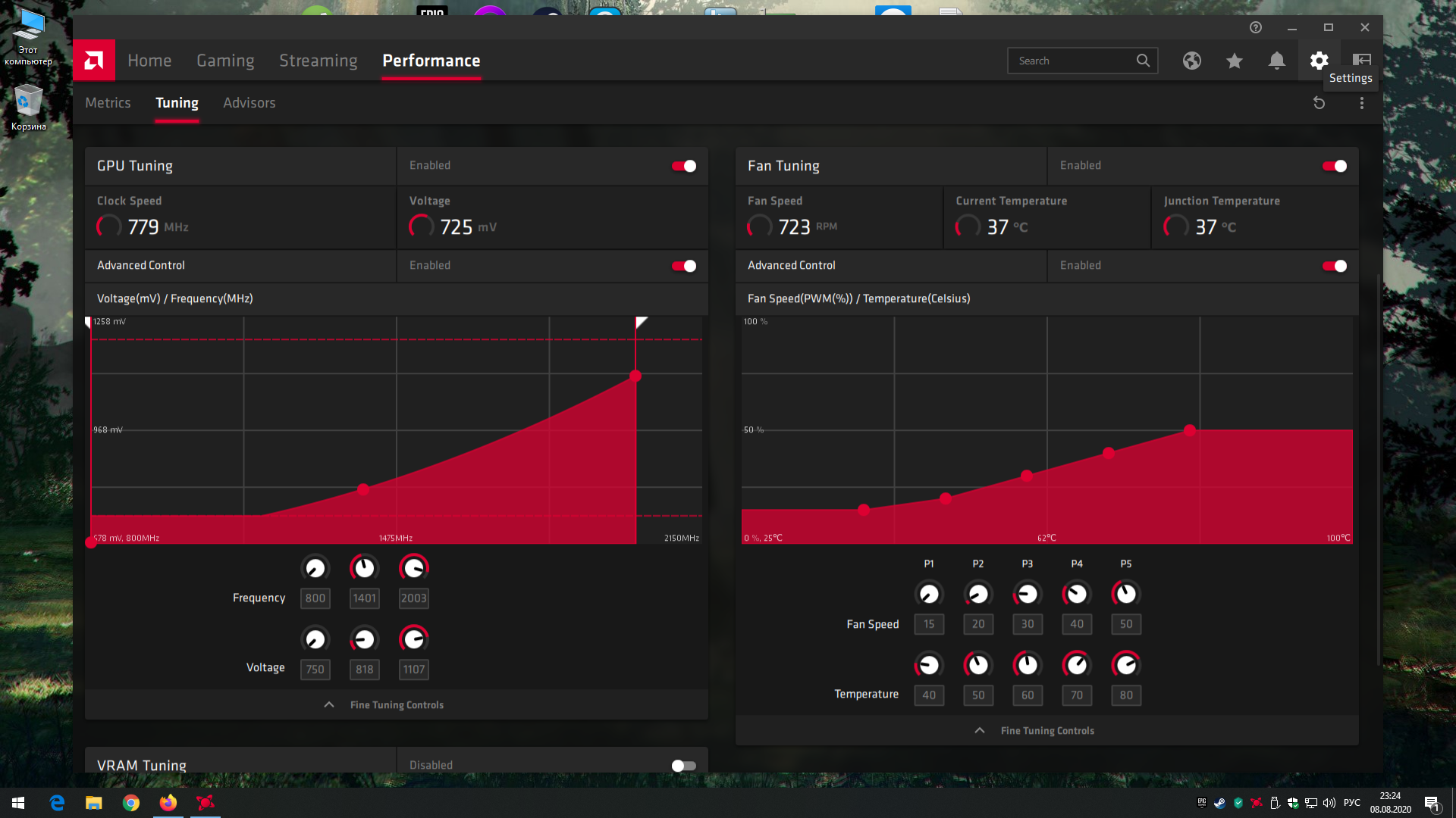 И кстати у меня пульс и память у меня на ней так дико не греется, как тут пишут. Максимум 84 градуса, но это и то когда совсем жарко на улице и ты тесты гоняешь. Настройки у меня такие: