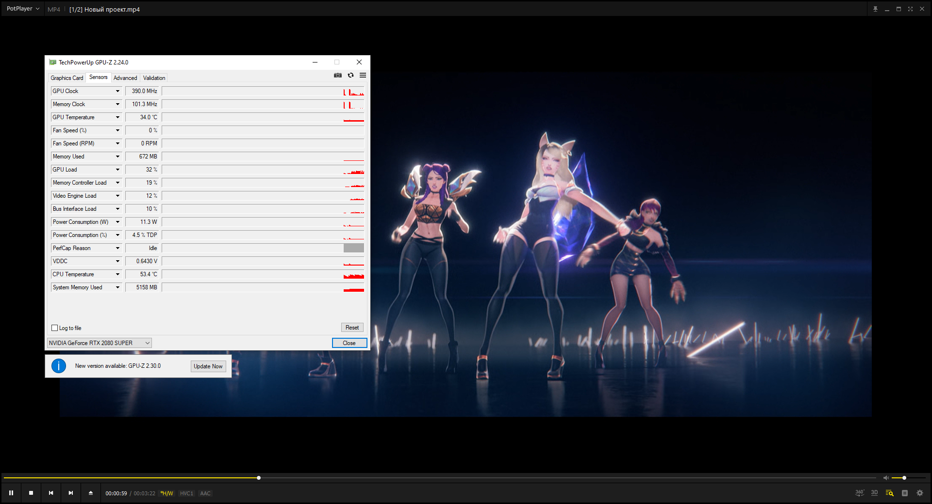 Показания GPU-Z при просмотре фильма в контейнере MKV.