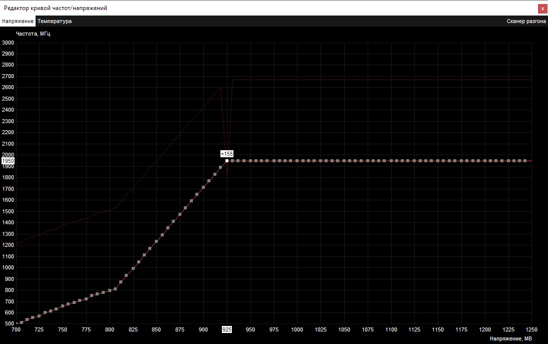 да, определяетесь с интервалом в два шага, у меня к примеру 2025-2055 при 0,962, ниже 2025 не падает вообще. настраивать нужно под фурмарком, ставите разрешение в котором играете и сглажку максимальную, нагреваете карту пару минут и открываете окно и настраиваете курву при запущенном фурмарке, если фурмарк валится значит не стабильно будет. очень удобно, он просто зависает и закрывается без вылета драйвера, запускаете его опять и можно дальше настраивать курву.