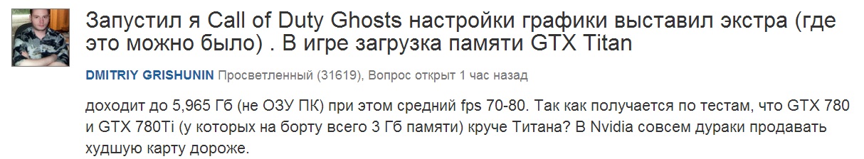 Тут есть один ролик и его автор, который выслал мне его почте, где якобы его TITAN нагружается по памяти до 6гб в CD Ghosts. Владельцы топ карт аля 7970б 780 и возможно титанов, отпишитесь по этому поводу, то есть по возможности повторите тест. Уж больно подозрительно выглядит его пруфф. Ссылко:http://www.youtube.com/watch?v=eDxGTjUCATQ&feature=youtu.be Вопрос на ресурсе Ответы.мыло.ру на скрине. Знаю, что на видео не загрузка видеопамяти или да....? Прошерстил на профильными ресурса, но ни где выше 2gb при full hd загрузка не была.