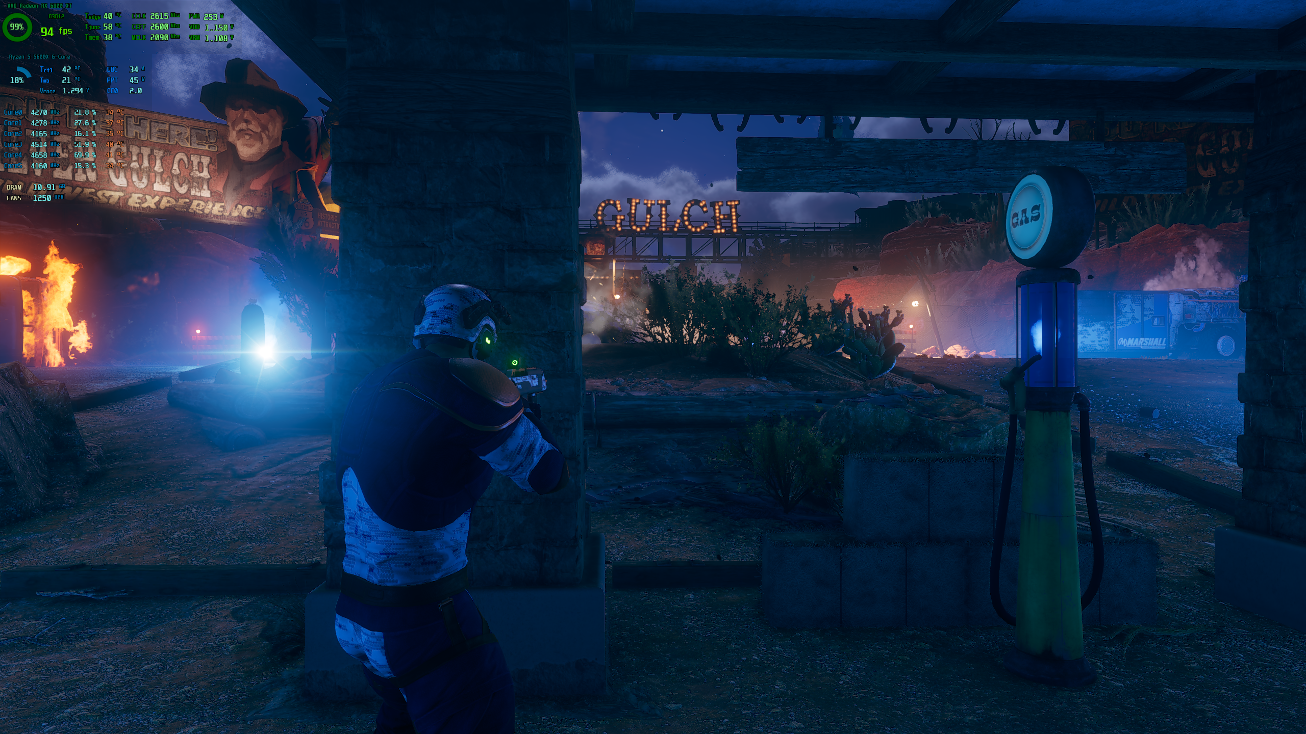 Работает в диапазоне 30-60 кадров при 20-30% загрузке ЦПУ и 30-40% загрузке ГПУ. ...Игра, видимо, тупо не любит железо АМД.