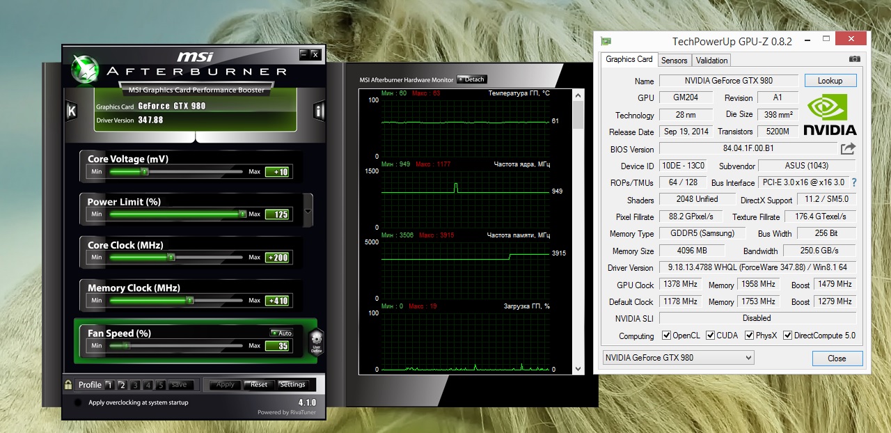 Andy3721 друг!!!подскажи,купил себе asus gtx 980 strix мучаюсь с разгоном,в бэнчах все пролазит а вот в играх,особенно в БФ4 вылиты бывают и такое ощущение что еще больше подвисания начинаются когда с разгоном играю,по отдельности память и чип в разгоне все ок,как вместе разгоню так траблы какие то!!!немогу золотую середину нащюпать,подскажи будь другом