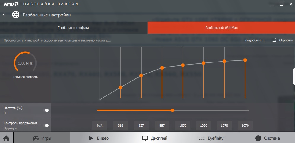 Q: По мониторингу напряжение на GPU немного отличается от установленного. A: Реально напряжение выставляется кратно 6.25 и округляется в большую сторону. То есть, если Вы выставили 1137, то реально у Вас будет 1137.5, а если выставили 1138, то уже реально будет 1143.75 мВ.