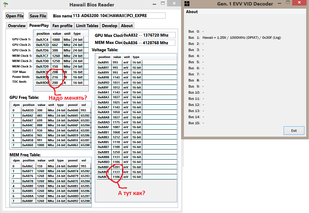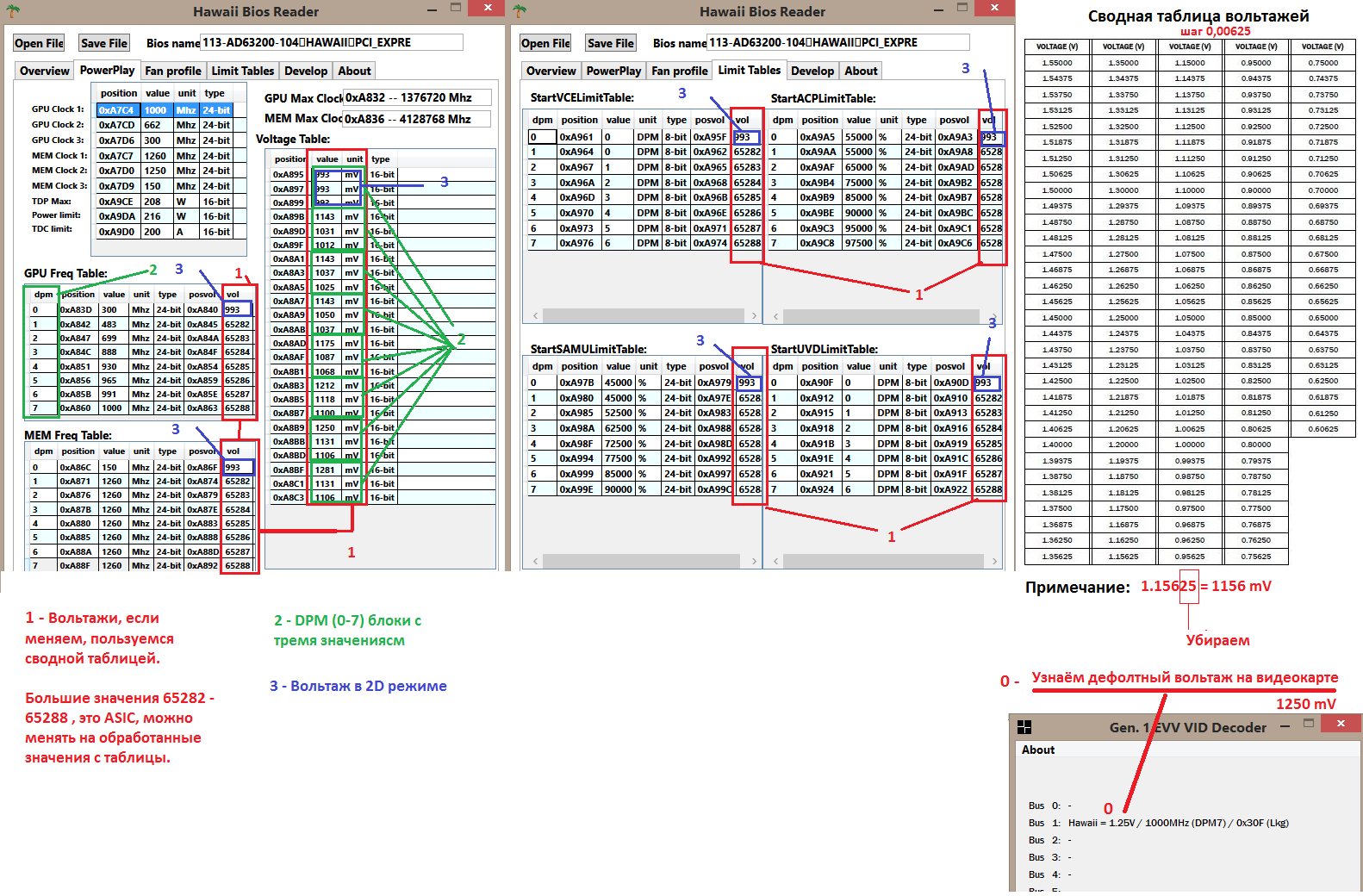 Art_2012 Лимиты вообще не трогай, тыже не гонишь карту, а наоборот по сути даунклочишь, значит этих лимитов будет хватать с головой. В таблице вольтажей последние 3 значения это какраз заданные рамки для dpm7, там просто надо прописать одинаковое значение какое тебе нужно, и егоже во все 6 таблиц с dmp7. То что в АБ ниже -39мв черный экран еще не значит что в 3D нельзя больше снижать, просто АБ снижает напругу по всем dpm на эту цифру, в том числе и в 2D, а тут ты снижаешь чисто там где тебе нужно. Биос проскакивал походу мой, пользуюсь и нарадоваться не могу Еще надо учесть что значения вольтажа подгонять по этой таблице http://cdn.overclock.net/8/8d/900x900px ... tages.jpeg