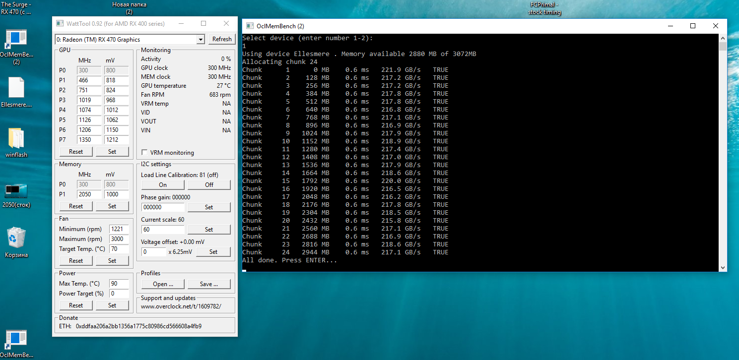 Q: Какое напряжение на чипе и контроллере памяти(КП) должны быть? A: Напряжение на чипе должно быть не меньше напряжения на контроллере памяти. Ваттман (и прочие утилиты) регулирует напряжение на КП, хотя написано что это напряжение на памяти!