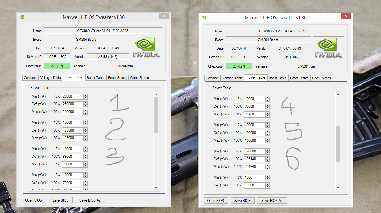 Информация от участника темы: olegdjus Решил и я свою лепту внести в разгон Maxwell (750ti/950/960970/980/980ti/TitanX) с рассмотрением ключевых параметры. Так как я не сторонник отключения Boost - то будем с ним. Но начнем с подготовки. а) Шьем крайний стоковый BIOS для Вашей карты. б) Качаем msi afterburner и gpu-z и устанавливаем их. в) Тут три варианта. 1)Если не желаем поднять напряжение - пропускаем пункт в. 2) Если желаем поднять на шаг или два (на разных карта даже одного производителя шаг напруги может быть разный, так что всё индивидуально) - прибавляем в ab по 10мВ к напряжению (остальные вкладки не трогаем) и во вкладке датчиков gpu-z(Sensors) смотрим нагрузку под встроенным рендером(нажать вопрос в первой вкладке gpu-z рядом с Bus Interface и нажать Start Render. Нас интересуют в датчиках показания GPU core clock и VDDC. Выбираем подходящий вариант и идем дальше. 3) Если желаем понизить напряжение - объясню во вкладке напряжений, чтобы не повторяться. Далее скачиваем архив с программами для редактирования и прошивки BIOS. Открываем с помощью MaxwellBiosTweaker свой BIOS и начинаем редактировать.