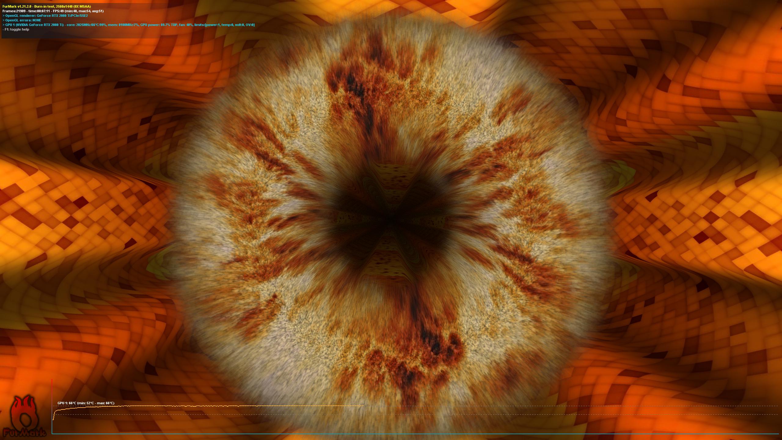 Вот еще скриншот из фурмарка: - 7 минут в 2к разрешении с 8x MSAA (больше не стал ждать, смысла нет) - температура стабилизировалась на 66 °С (вертушки 40%) - частоты около 2000 MHz (гуляют от 1960 до 2025) - ошибок OpenGL нет