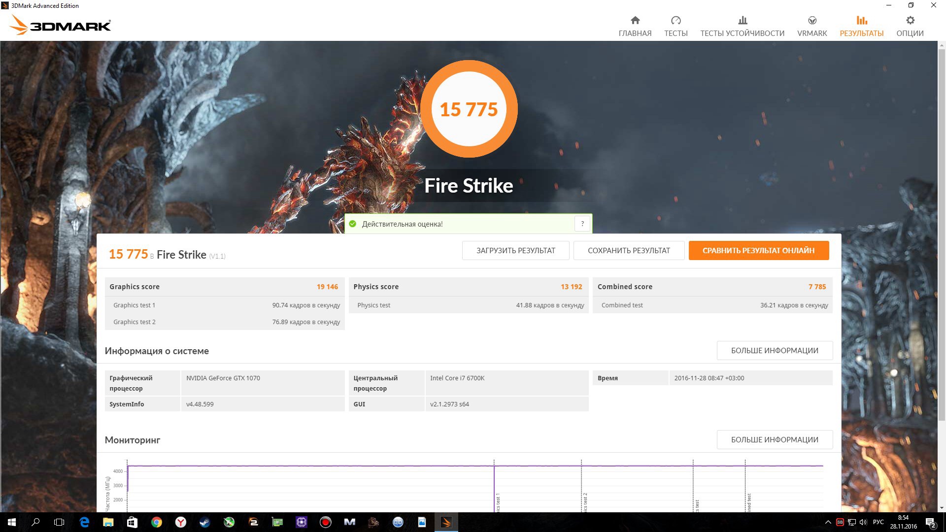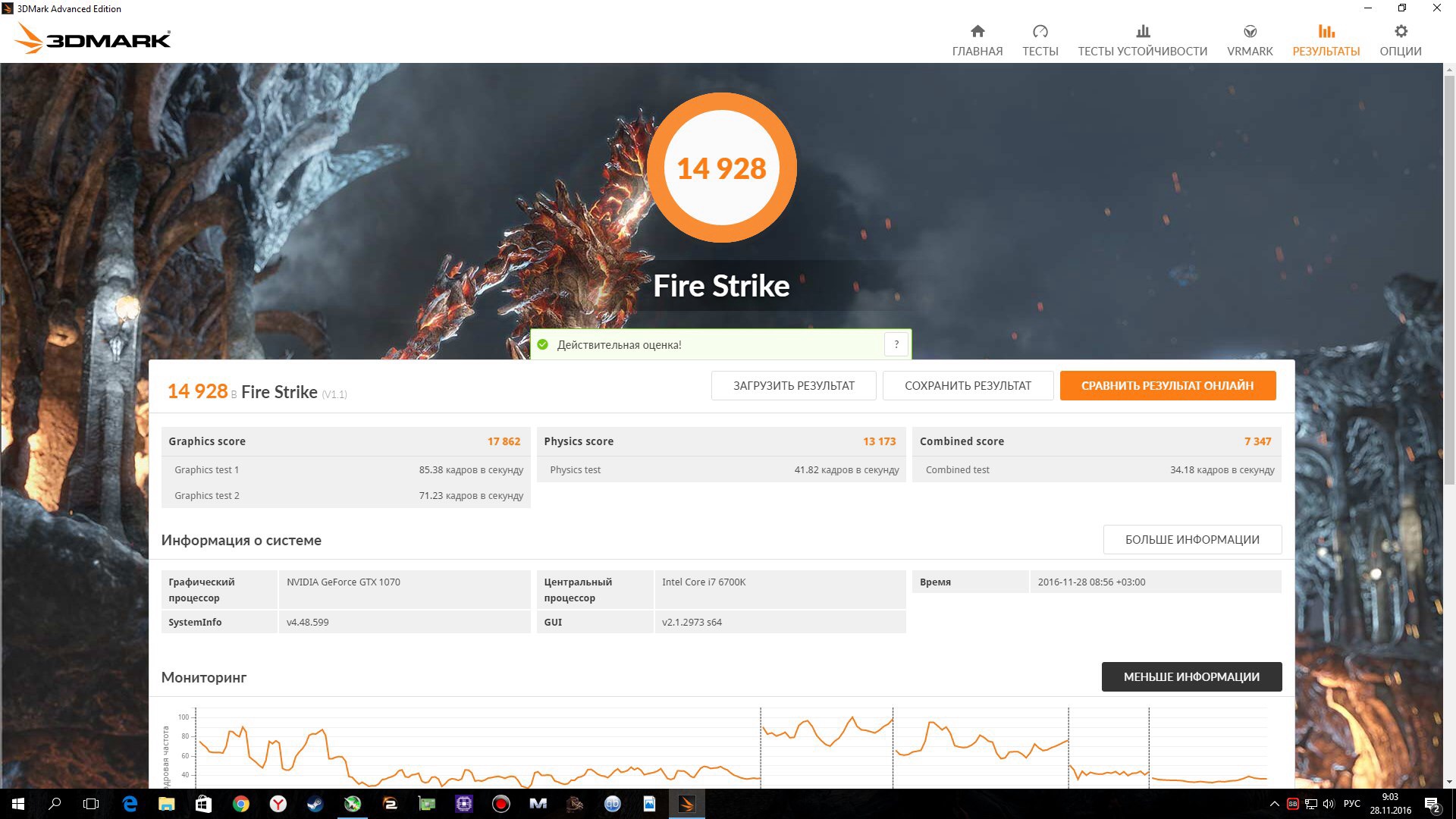 Доброго дня. Хотел выразить свою благодарность,всем людям,которые делятся всевозможной информацией,котороя находиться в FAQ.И соответственно людям,которые этот самый FAQ составили! Проштудировав статьи об Андевольтинге,снизил вольтаж и немного разогнал свою MSI GTX 1070 Gaming X. Экземпляр не самый удачный,в стоке бутстит 1886-1911мгц напряжение 1.050-1.062v. Снизил вольтаж до 0.950v,работает стабильно на стоковой частоте 1886мгц. Температура упала в среднем на 3-5C. С понижением напряжения,до 0.0925,ту же частоту в 1886мгц уже не держит.В играх и бенчмарках артефакты и вылеты. Оставил на постоянку напругу 1.000v,ядро удалось стабильно разогнать до 1987мгц по ядру и 9400мгц по памяти. Прирост в зависимости от игры,в среднем 5-6 FPS. Поделился с Вами результатами. Прилагаю фото из 3DMark Fire Strike. В стоке и разгоне. Как по мне,вполне не плохо! Как по Вашему мнению? Буду дальше экспериментировать! Ещё раз спасибо,наконец то хоть более или менее разобрался как разгонять ВК в MSI Afterburner с помощью Curve.