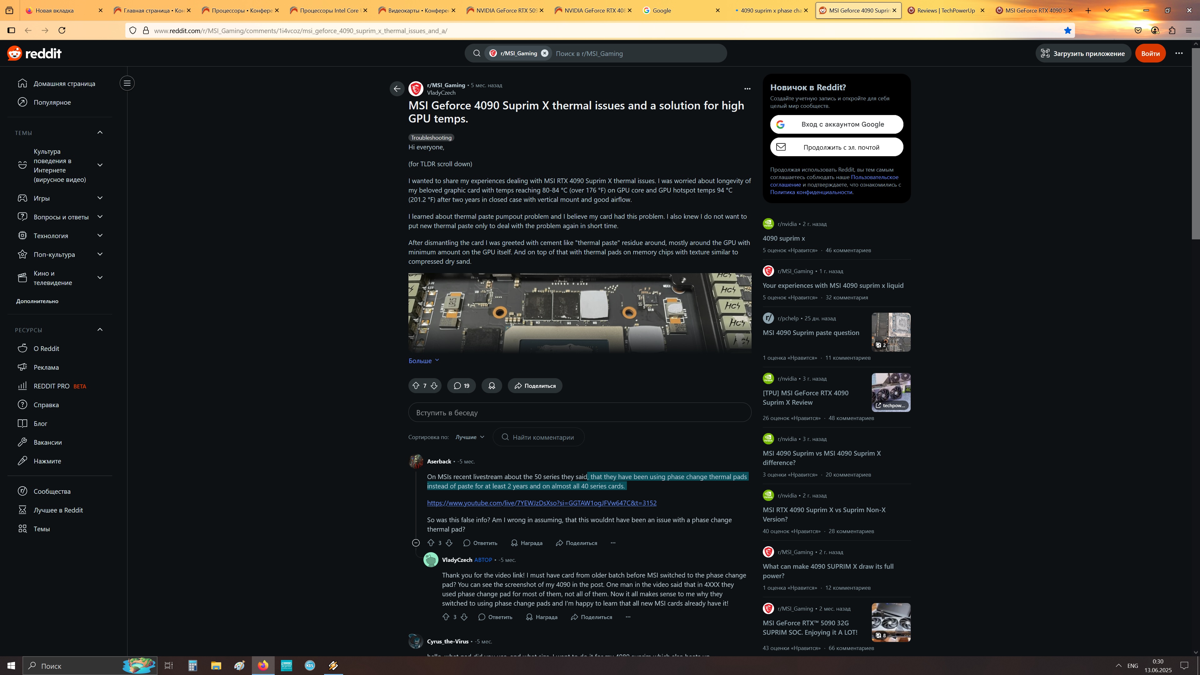 Нет там никакого фазового перехода, что гига, что мси мажут обычную пасту, которая через год, полтора высыхает. Затем при любом движении ПК паста растрескивается и хотспот улетает в небеса. У меня на 4090 гиге паста продержалась то ли год, то ли полтора. Пластинка фазового перехода, чуть новых прокладок и более никаких проблем.