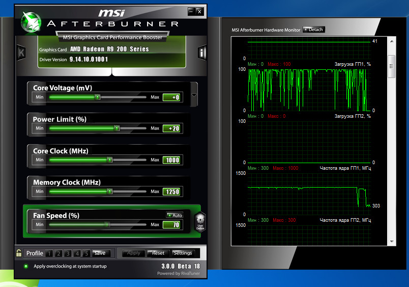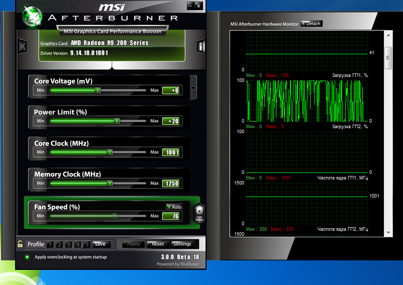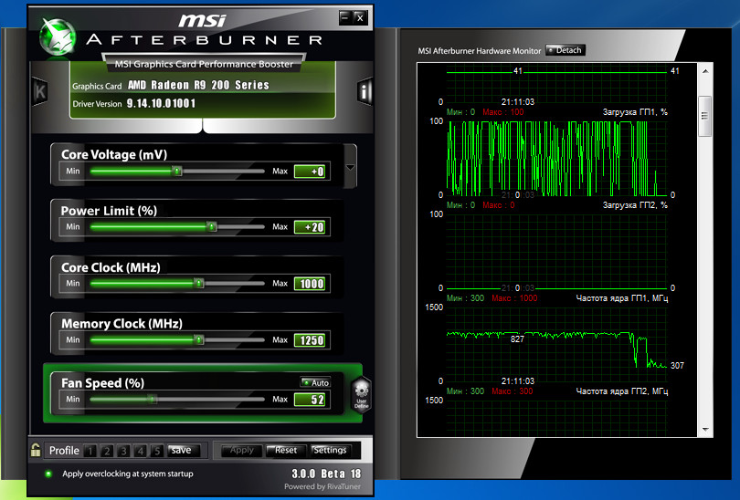 Частота GPU перестала плясать и все время зафиксирована на 1001мгц. На ПИЛУ это никак не повлияло. Загрузка GPU хаотичная.
