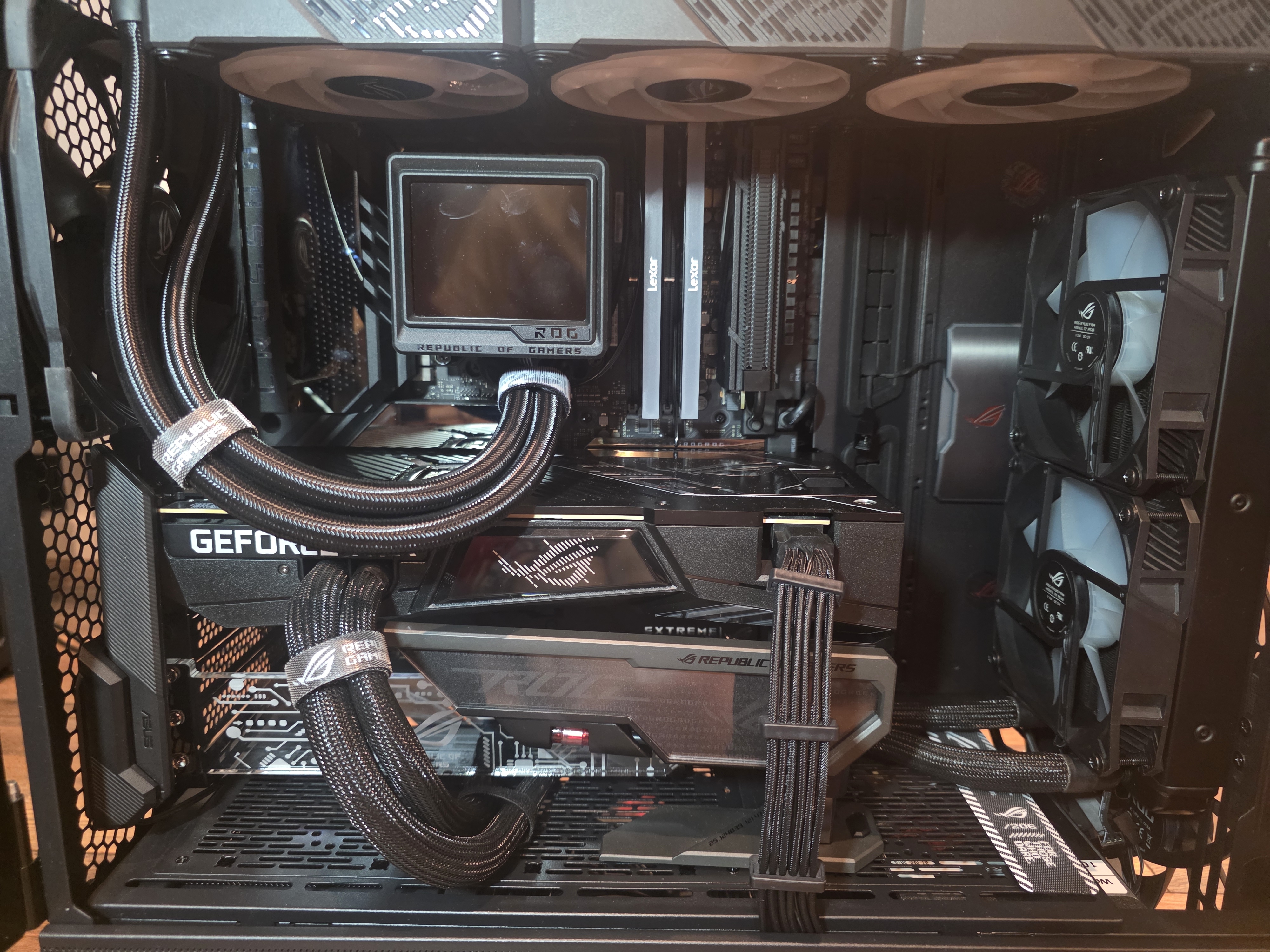 На замену своей ASUS Prime 5080 взял 4090 в редком исполнении (STRIX LC) Хочу отметить феноменальные температуры (GPU-Hotspot-Memory) Простой (28-38-38) - вентиляторы и турбина на ВК не крутятся) Нагрузка (60-70-65) - работа ВК очень тихая, не слышно ни помпы, ни дросселей, ни турбины (для VRM)) Для такого монстра это прекрасный результат