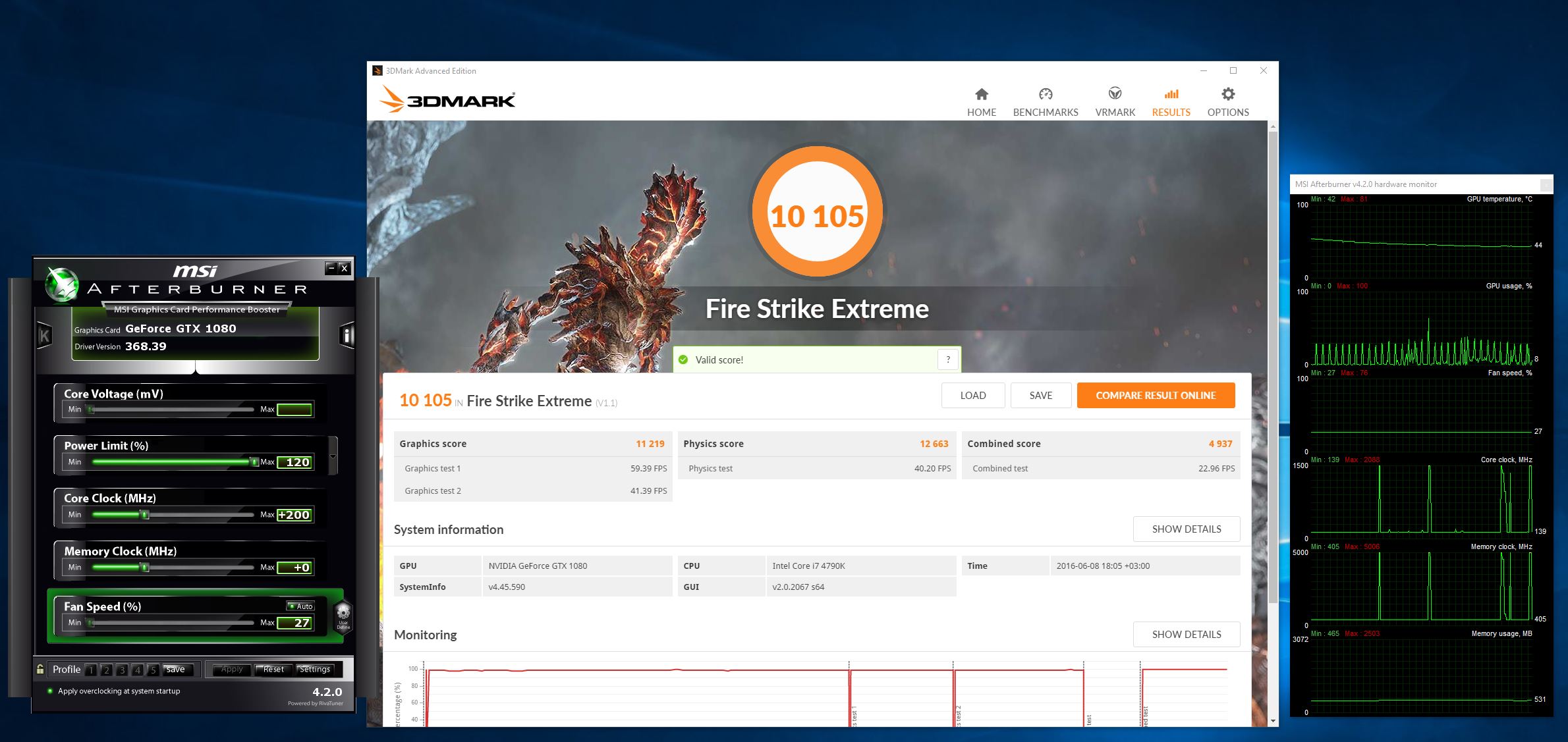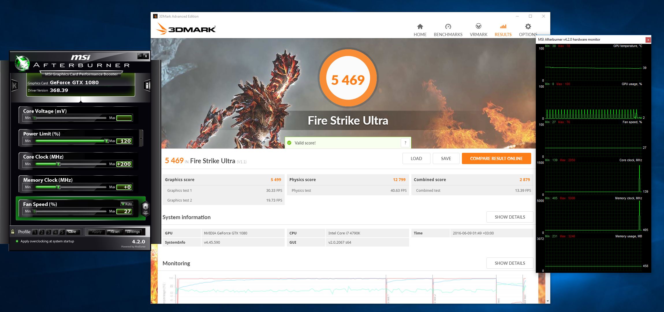 Fire Strike Extreme - GTX1080 [+200mhz] - graphic score - 11219. у тебя 9246. разница 21.3% от твоего резалта Fire strike Ultra - GTX1080 [+200mhz] - graphic score - 5499. у тебя 4790. разница 14.8% от твеого резалта.