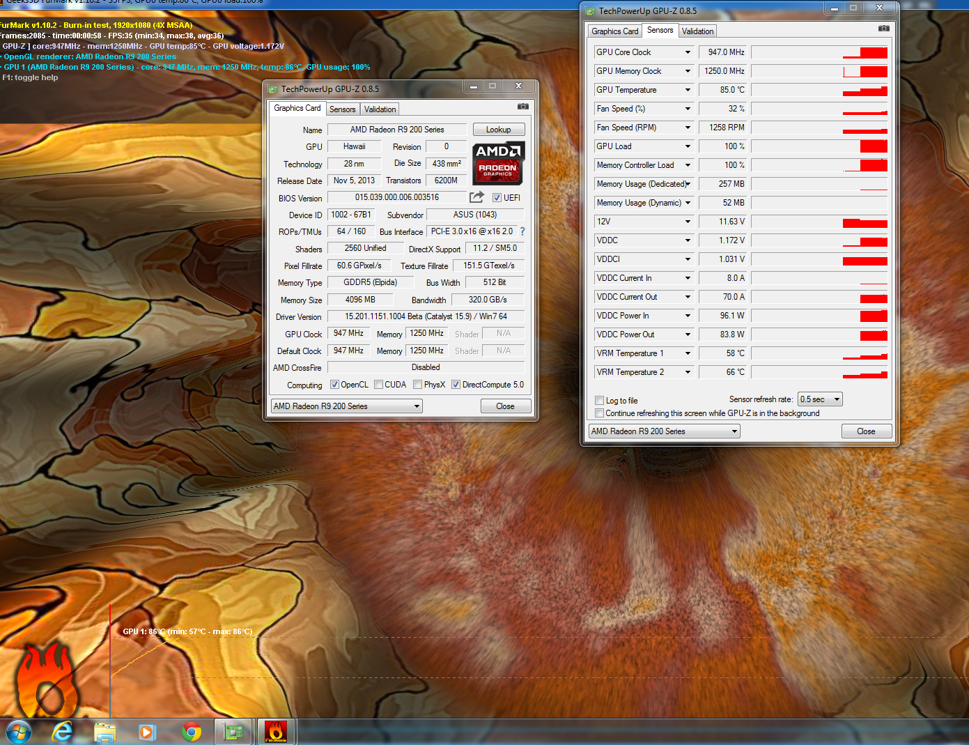 Прощупал минимальный вольтаж для стоковых частот R9 290. Карта работает абсолютно стабильно при 1.112в. Нестабильность наступает, если снизить до 1.100в. 1.106в - уже без проблем, но просто для страховки накинул еще 0.006в. Темпа упала, конечно, заметно. Турбина на 43%, темпа максимум 85. Турбина на 48%, макс темп меньше 80. Врм вообще холодный. В heaven и valley карта кушает меньше 150Вт. Считай, получилась Нвидиа В итоге, при более-менее приемлемом шуме можно легко скинуть темпу до <75. А если выбирать тишину, то карта все равно легко вписывается в рекомендуемые температуры. Не так страшны 290-е, как их малюют.