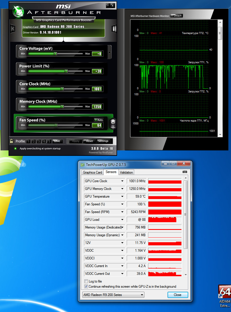 Поскольку, как и в случае с AMD Radeon R9 290X, эффективность системы охлаждения Radeon R9 290 оставляет желать лучшего, для проверки на разгон мы были вынуждены зафиксировать скорость вращения вентилятора её системы охлаждения на 60% мощности или 3380 об/мин, и по-прежнему отказались от использования повышения напряжения на ядре, оставив такие эксперименты для оригинальных видеокарт.
