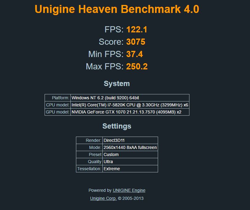 владельцы GTX1070 SLI, можете прогнать Heaven Benchmark 4, 2560x1440 maxed? в 1080 СЛИ я разочарован. суть в том что если карта одна, разница между 1070 и 1080 15-20%. а вот если карты ДВЕ и оба системы в разгоне, разница 7-9% судя по 3dmark FireStrike Ultra. так же просьба прогнать 3Dmark FireStrike Extreme