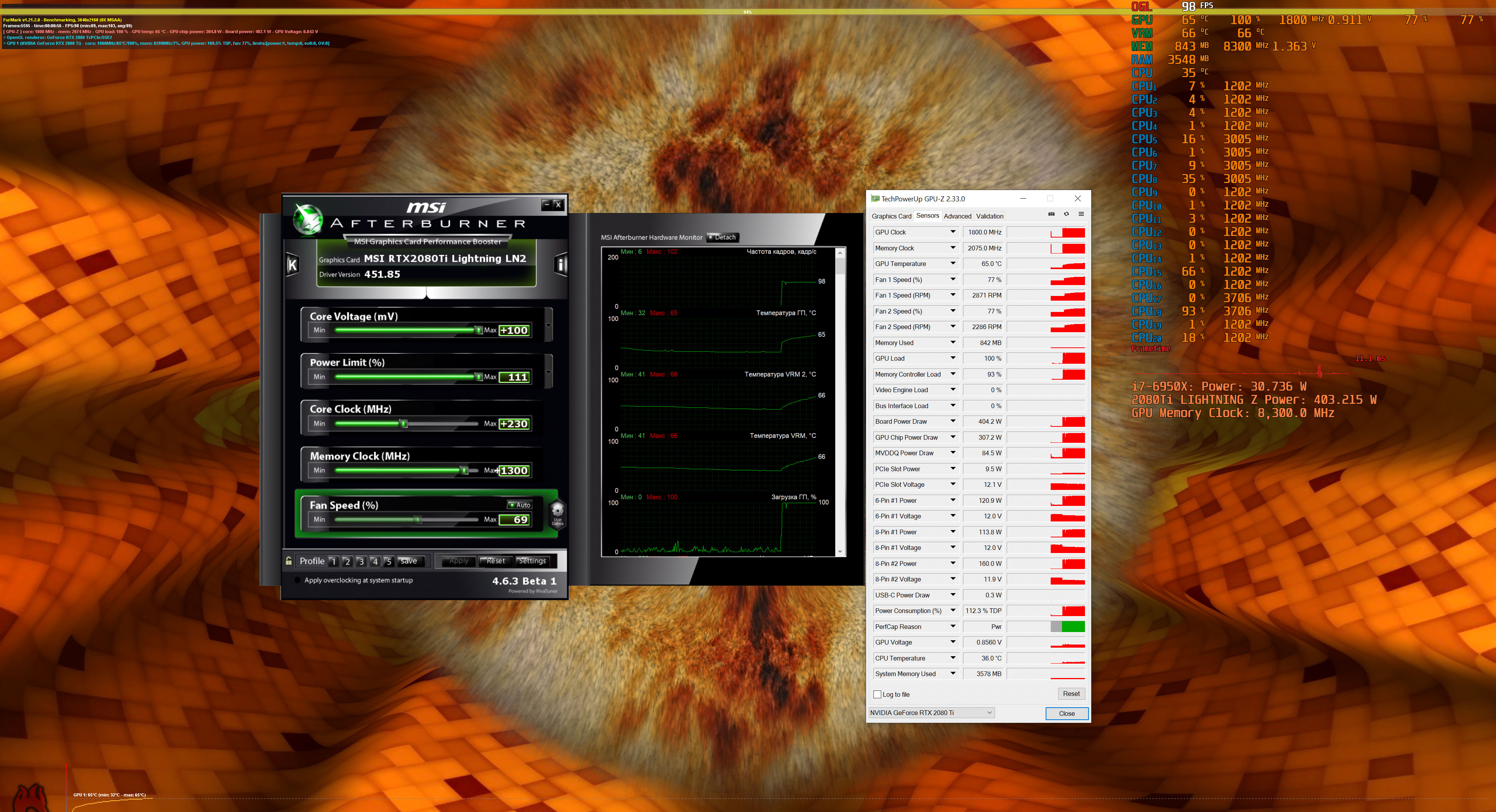 ParKur А причём тут зелёный или фиолетовый, ты смотри на TDP 112% и на энергопотребление в 400 вт. Что установлено в MSI Afterburner то и держит в стресс тесте и даже больше.