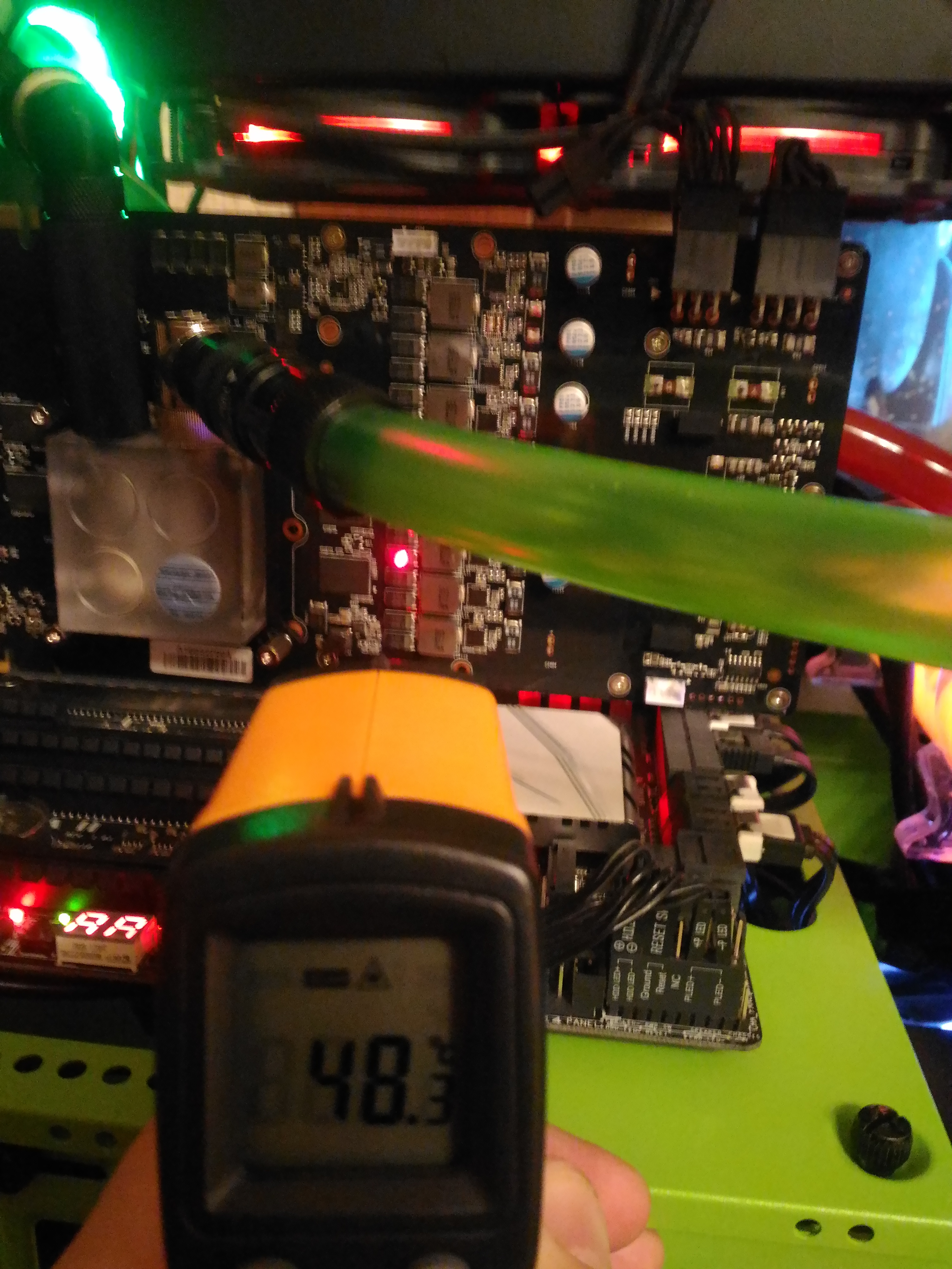 Господа, кто любит переживать о температуре питальника. Palit GRP gtx1080, отсутствие какого-либо охлаждения питальника, прогон fsu. Самая горячая точка в конце теста-54℃. На голом питальнике!