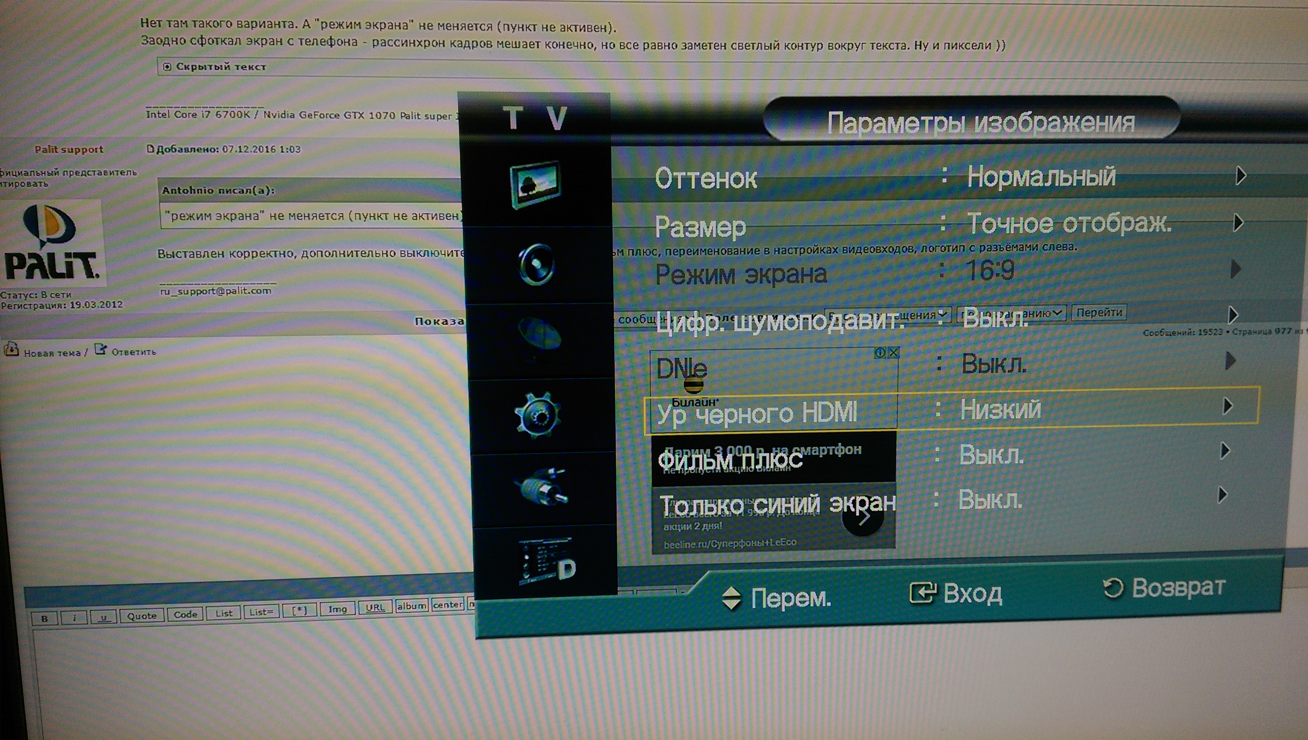 Нет там такого варианта. А "режим экрана" не меняется (пункт не активен). Заодно сфоткал экран с телефона - рассинхрон кадров мешает конечно, но все равно заметен светлый контур вокруг текста. Ну и пиксели ))