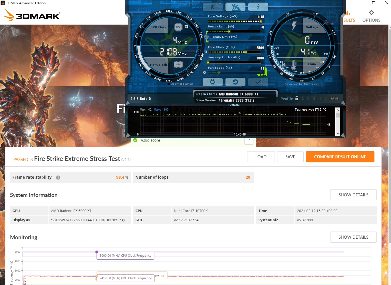 частота 2350-2430 после пересмотра вентиляции в корпусе макс ХотСпот 103. можно 10 ватт и навалить а так выкладываю результаты нового теста на новом драйвере