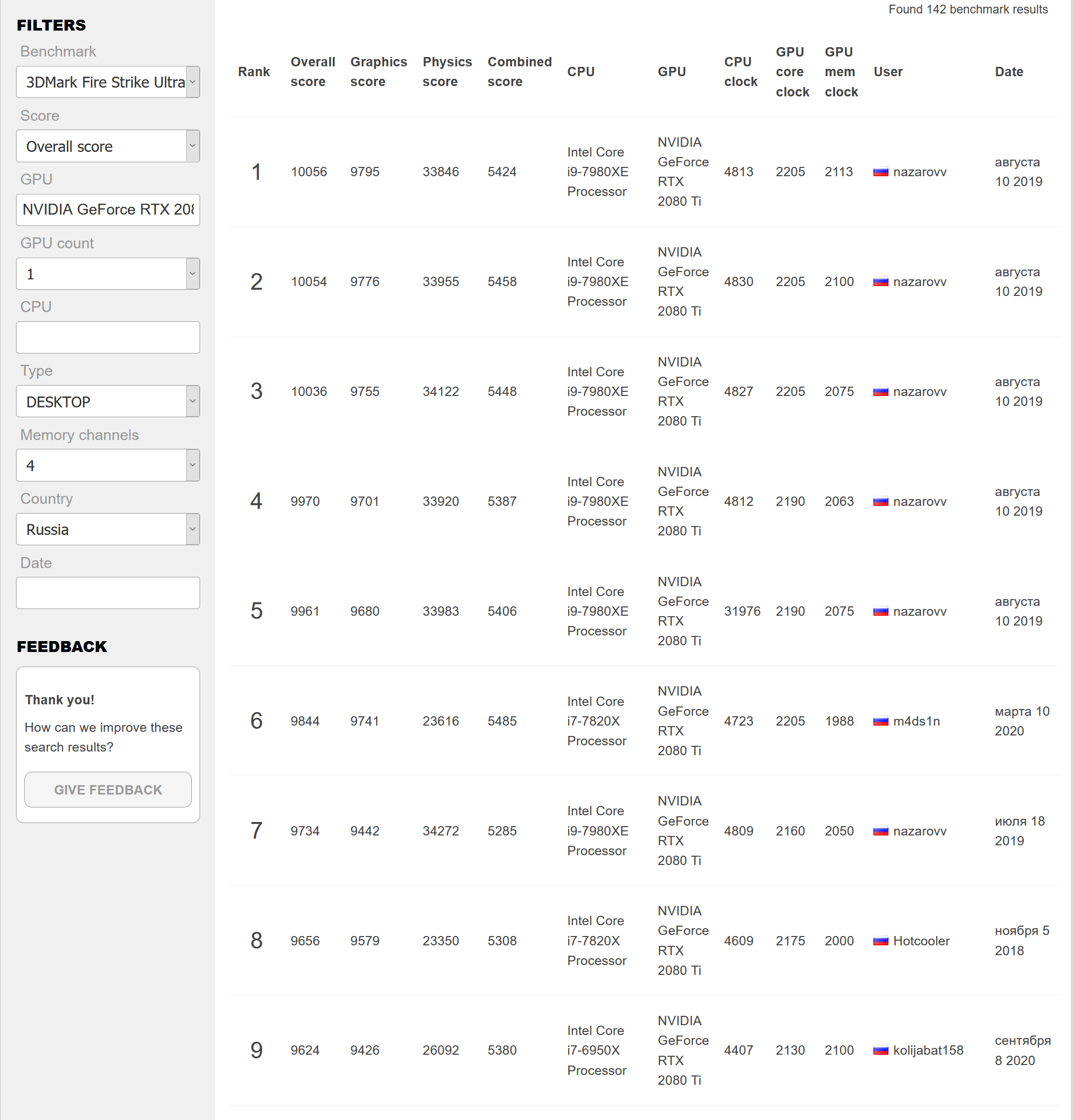 Взял на продажу у знакомого 2080Ти. Ничего так результаты выходят по сравнению с моей 2070S. Память Самсунг на Тишке. https://www.3dmark.com/3dm/50181677?