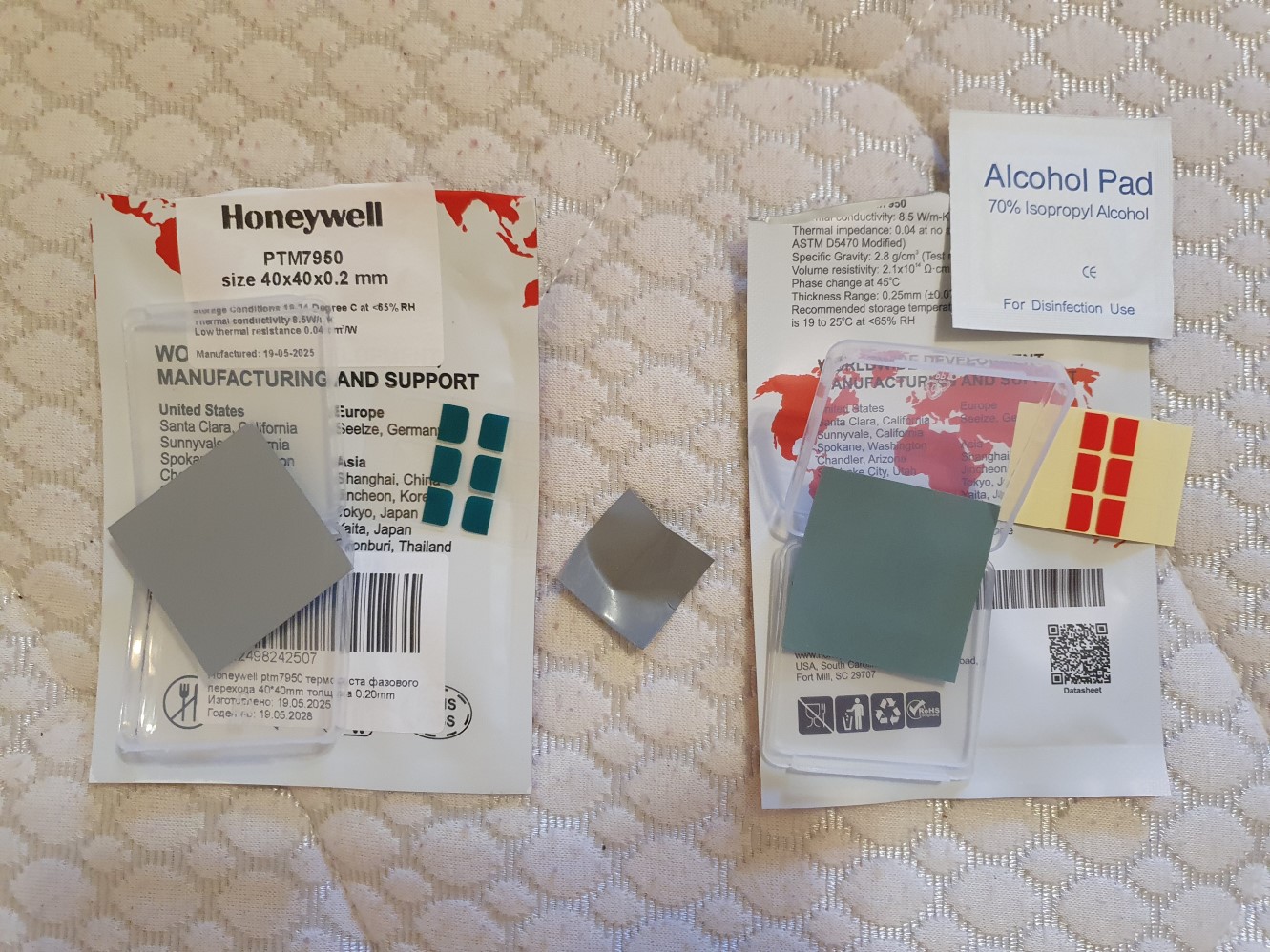 справа, та что с зеленой пленкой, на ощупь тоньше, но на левой обе защитные пленки толстые. Обе PCM в коробочках, на вид или на ощупь 0.2 и 0.25 не отличишь, а возможно они вообще одинаковые - на второй упаковке указано 0.25mm и thickness range +- 0.075mm, т.е. от 0.175 до 0.325мм - ребята угарают походу. С обоих снять пленку проблематично при 26° в комнате, подцепляя скальпелем легко повреждается маленький уголок материала. Нанес на чип ту что слева, положив в холодильник предварительно, по кач-ву претензий нет