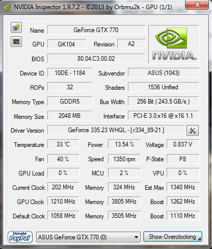 1262 это по гпу-з (сегодня обратил внимание что в лог файле показывает 1338) , а энвидиа энспектор сразу показал действующий режим буста в размере 1340 . и вот еще разгон я вообще тестил хеавеном в такие же настройки только теселяция - масштаб \ коэффициент \ дальность , выкручивал на максимум . (т.е все до предела) тестировал минут 40 - все ОК температуры при этом были гораздо ниже чем в 3DMark 11... я бы даже сказал на много ниже ... по чипу 67 градусов предел был .