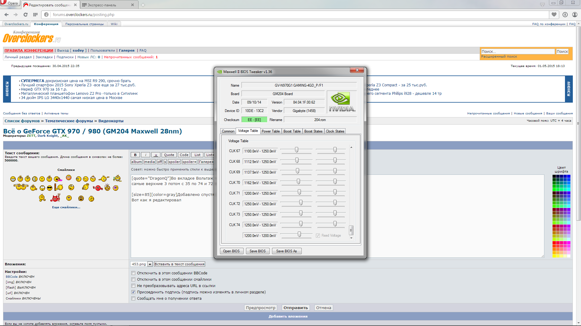 Информация от участника темы: Аффторитет Приведу пример как разгонять карты 970/980/980ti по таблице буст частот. Не буду писать как бекапить/сохранять биос, как и какие ставить поверлимиты - все это есть в шапке темы в инструкции по разгону. Образцом к материалу будет моя MSI GTX970 gamming 100ME. Поиграл я с разгоном в Afterburner-e и решил зашить разгон в биос. Задача разогнать карту бустом до 1506МГц при напруге в 1.231в. Начинаем.