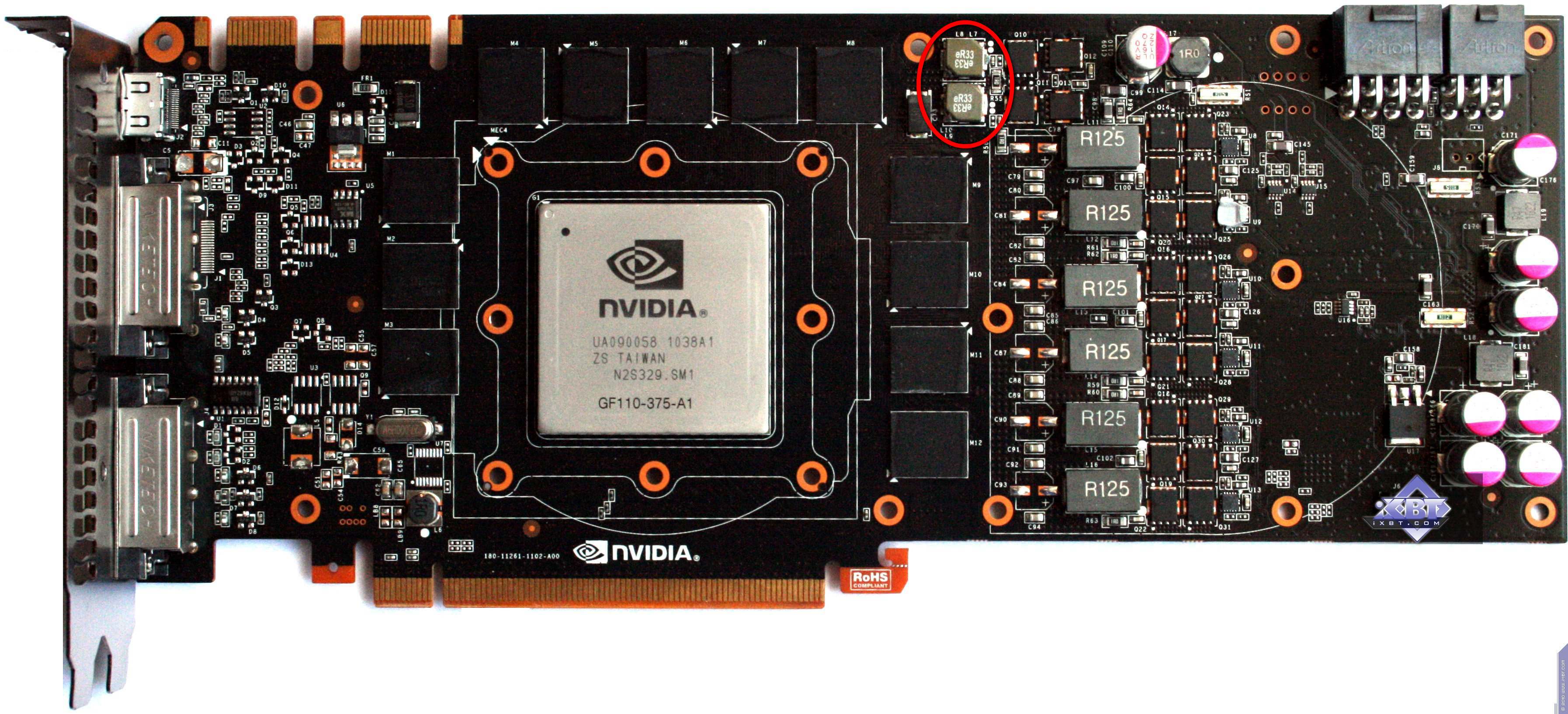 Здраствуйте форумчане. На фото ниже, всем в этой теме известная, gtx580 (референс). обведены красным две катушки индуктивности с маркировкой eR33, в ходящие в цепь питания оперативной памяти. У меня версия от Gigabyte, детали малость отличаются внешне-- они правильно квадратные, темно-коричневого цвета и маркировка-R33 (но думаю, просто производители разные и отличий в тех.плане нет). Собственно, одна индуктивность у меня на плате приказала долго жить (имеет следы термического повреждения).. вот уже 3и сутки тщетно ищу любую информацию по этим деталям. Т.е. суть поста- найти, где таких можно прикупить, или чем заменить, ну либо хотябы узнать их харрактеристики чтобы дальше думать самому. Последняя надёга на этот мощный форум. Зарнее спасибо