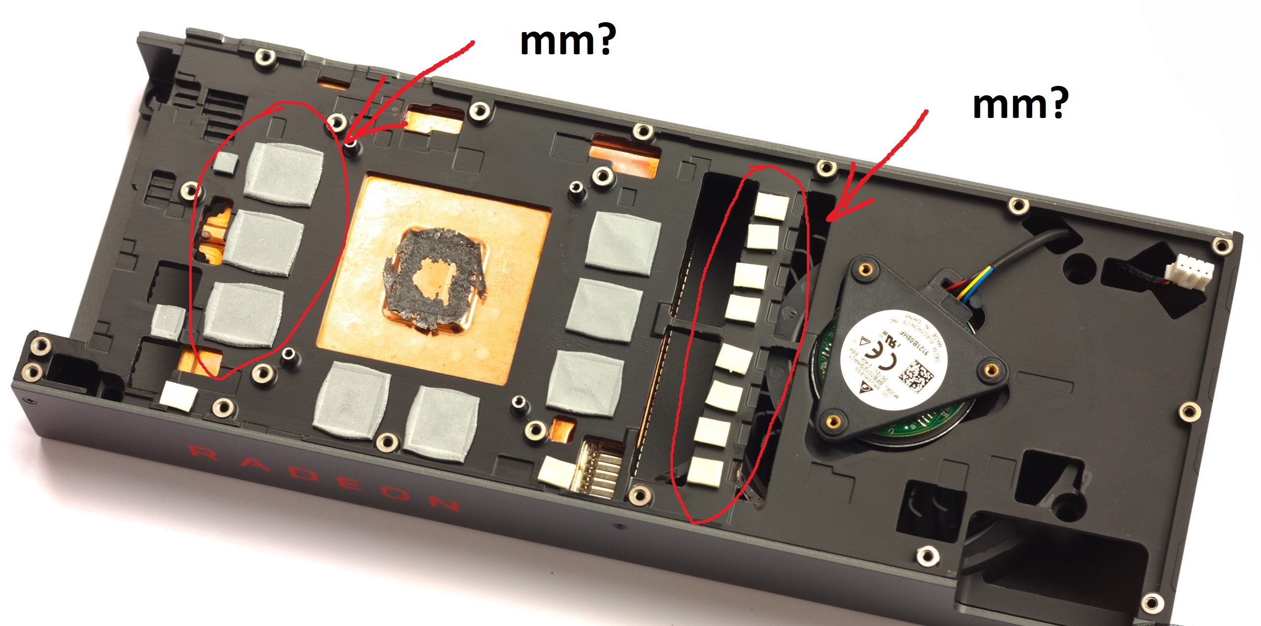 Roma1994 на ютубах подсмотрел, если не удается узнать правильные толщины прокладок, они кстати еще разные могут быть на одной карте. Берешь пластилин, кладешь шарики на чипы и собираешь полностью охлад, с винтами и т.п. А потом разбираешь и уже будет видно точно что там по толщине и где. Да и кстати родные прокладки че выбросил уже? Можно измерить же.