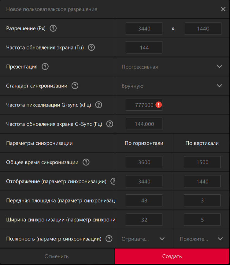 Подключен через DP 1.4 (в спецификации на монитор указан), кабель комплектный. Через CRU всё выглядит так - какую бы я настройку не выбирал, 144 выставить не даёт. Изначально 120, но видимо драйвер форсирует, так как показывает что 144 в Панеле винды и в Адреналине