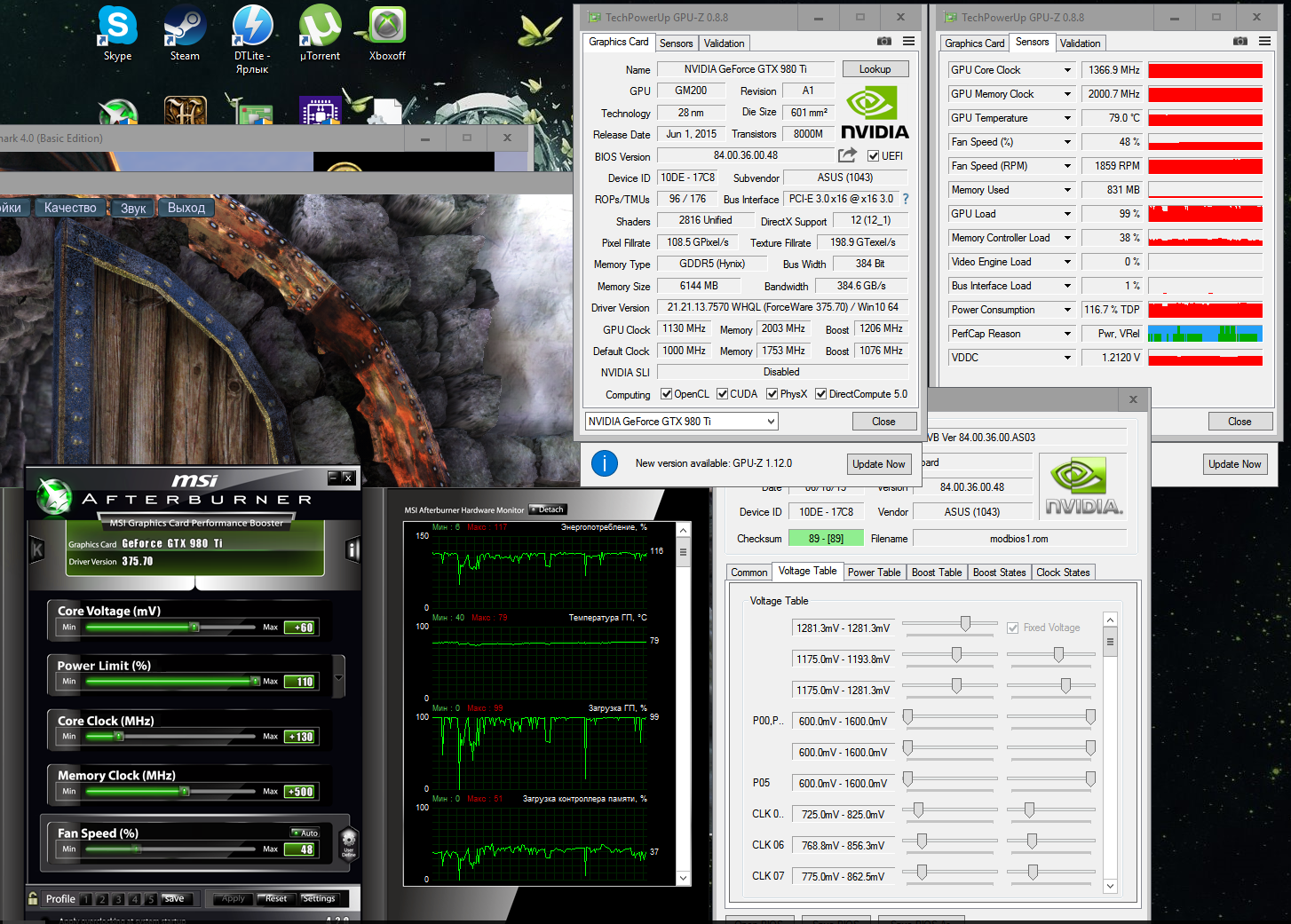 Доброго времени суток знатокам! Принимайте в ваши ряды!) На форум захожу довольно давно (лет 5 наверно), и вот решил наконец зарегаться. Обновил тут свои gtx660 в sli в 2015г(в ноябре) на 980ti Strix(Asic 78%), которая была удачно приобретена на авито за 42к(с гарантией регарда 3 года, ну без 2 недель ибо с рук взял), в тот момент в магазинах она стоила минимум по 54-57к, вообщем довольный был как слон, пока естественно не вышла 1080)) хотя и сейчас в принципе ей доволен, брал сравнить у товарища gtx1070, так 980ti в среднем на 5 кадров впереди, тут я успокоился и жду либо 1080ti, ну либо посмотрим-поглядим на Volta. -Немного отступил я от того чего хотел собственно, а хотел я помощи попросить в разгоне, собственно. -Помогите пожалуйста товарищи знатоки, столкнулся вообщем с проблемой модификации биоса, запутался как и чего делать, иду строго по инструкции в шапке, остановился на этих таблицах с турбо-бустами, не понимаю в какой ячейке именно мой турбо-буст тот который 1076MHz(который пропечатан в gpu-z)или фактический буст в играх который 1215MHz, а как дочитал до НЕХ-редактора про шестнадцетиричную последовательность так вообще башка потекла! -Кто знает помогите пжлста, что именно конкретно последовательно мне делать и чего нажимать?!