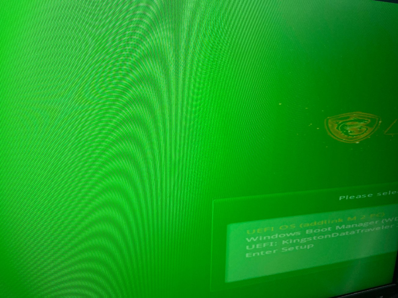 Попала недавно в руки 5700 XT от Sapphire с неизвестной предысторией, вызвавшая странную проблему. После установки видеокарты и включения ПК, всё изображение на экране было залито ядовито-зеленым оттенком на протяжении всех стадий загрузки ПК (начиная с заставки материнской платы и заканчивая операционной системой). И только после установки драйверов, зелёный оттенок в винде полностью пропал. В итоге видеокарта работает идеально под любыми нагрузками, вообще никаких проблем с картинкой. Но во время загрузки и в биос всё равно остается этот ядовито-зеленый оттенок. С другими видеокартами, как Nvidia, так и AMD, подобных проблем на этой системе не возникало. Пробовал другой HDMI кабель, другой порт на мониторе и видеокарте - безрезультатно. Пробовал переключение биос, также не дало эффекта. Кто-то сталкивался с подобным? Фото проблемы (фото не моё, но проблема выглядит абсолютно идентично):