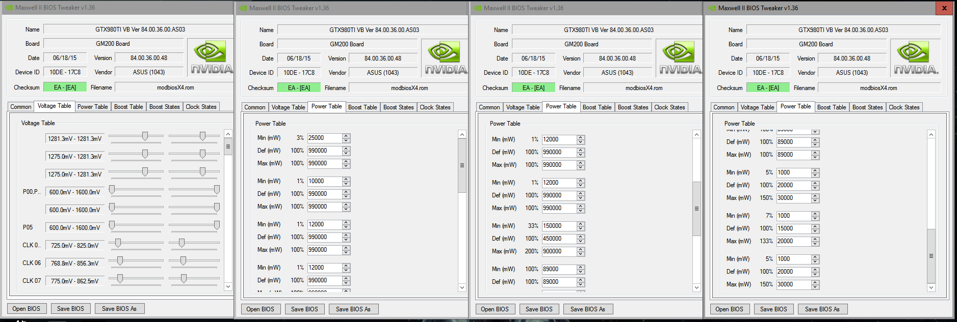Информация от участника темы: Аффторитет Приведу пример как разгонять карты 970/980/980ti по таблице буст частот. Не буду писать как бекапить/сохранять биос, как и какие ставить поверлимиты - все это есть в шапке темы в инструкции по разгону. Образцом к материалу будет моя MSI GTX970 gamming 100ME. Поиграл я с разгоном в Afterburner-e и решил зашить разгон в биос. Задача разогнать карту бустом до 1506МГц при напруге в 1.231в. Начинаем.
