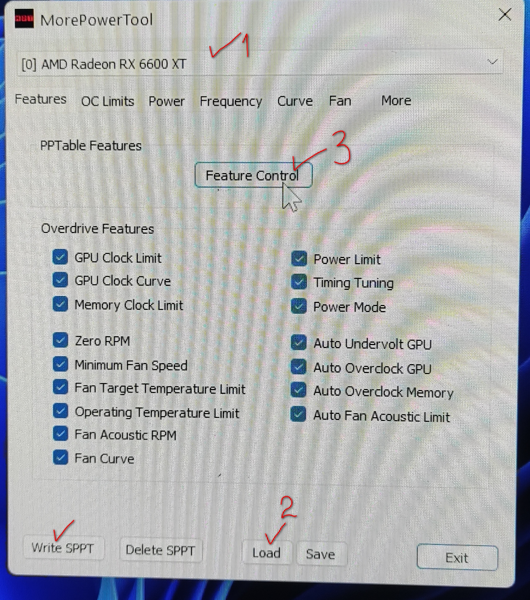 4. Нажимает Load (цифра 2 на фото) и выбираем свой биос сохранённый через gpu-z 5. Нажимаем Feature Control (цифра 3 на фото) 6. Отключаем, снимаем 2 птички FW_DSTATE и GFXOFF, нажимаем ОК.
