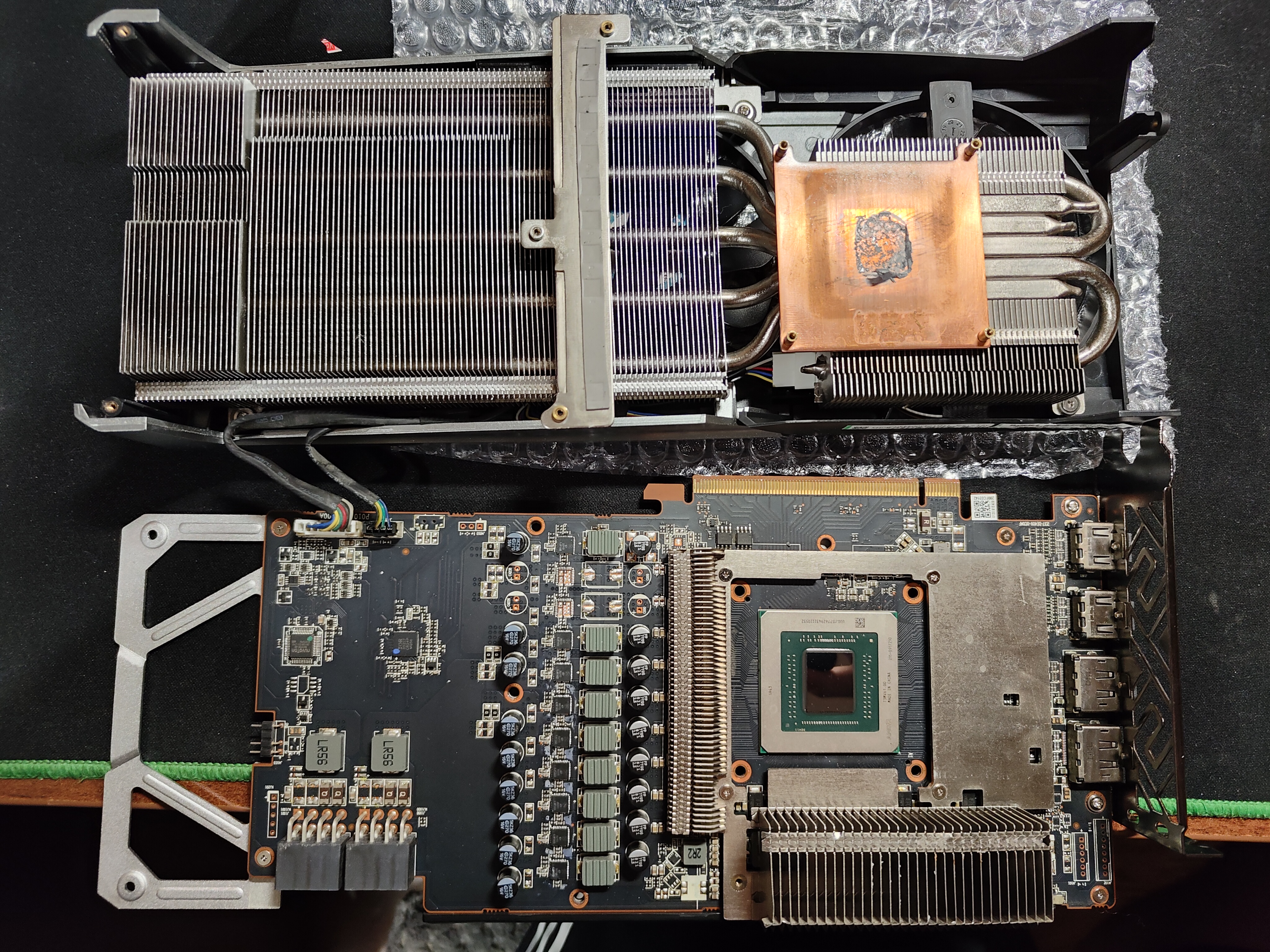 *Во всех случаях (кроме водоблока полного покрытия) доработки или замены системы охлаждения вы столкнётесь с необходимостью охладить до приемлемых значений память. Прошу вас уделить этому должное внимание - ни Morpheus, ни Accelero, ни AIO водянки не решают проблему охлаждения памяти. Это универсальные решения, они не могут учесть особенностей данной серии видеокарт и конкретно вашего экземпляра. GDDR6 довольно горячая память, поэтому в любом случае надо будет что-то делать дополнительно для её охлаждения. Так как зачастую производители этих универсальных СО не решают вопрос с охлаждением памяти, в комплектах либо совсем нет радиаторов для памяти, либо имеющиеся недостаточно эффективны для охлаждения именно GDDR6. Очень хороший пример того, с чем предстоит столкнуться, если вы захотите кардинально решить вопрос с охлаждением памяти.