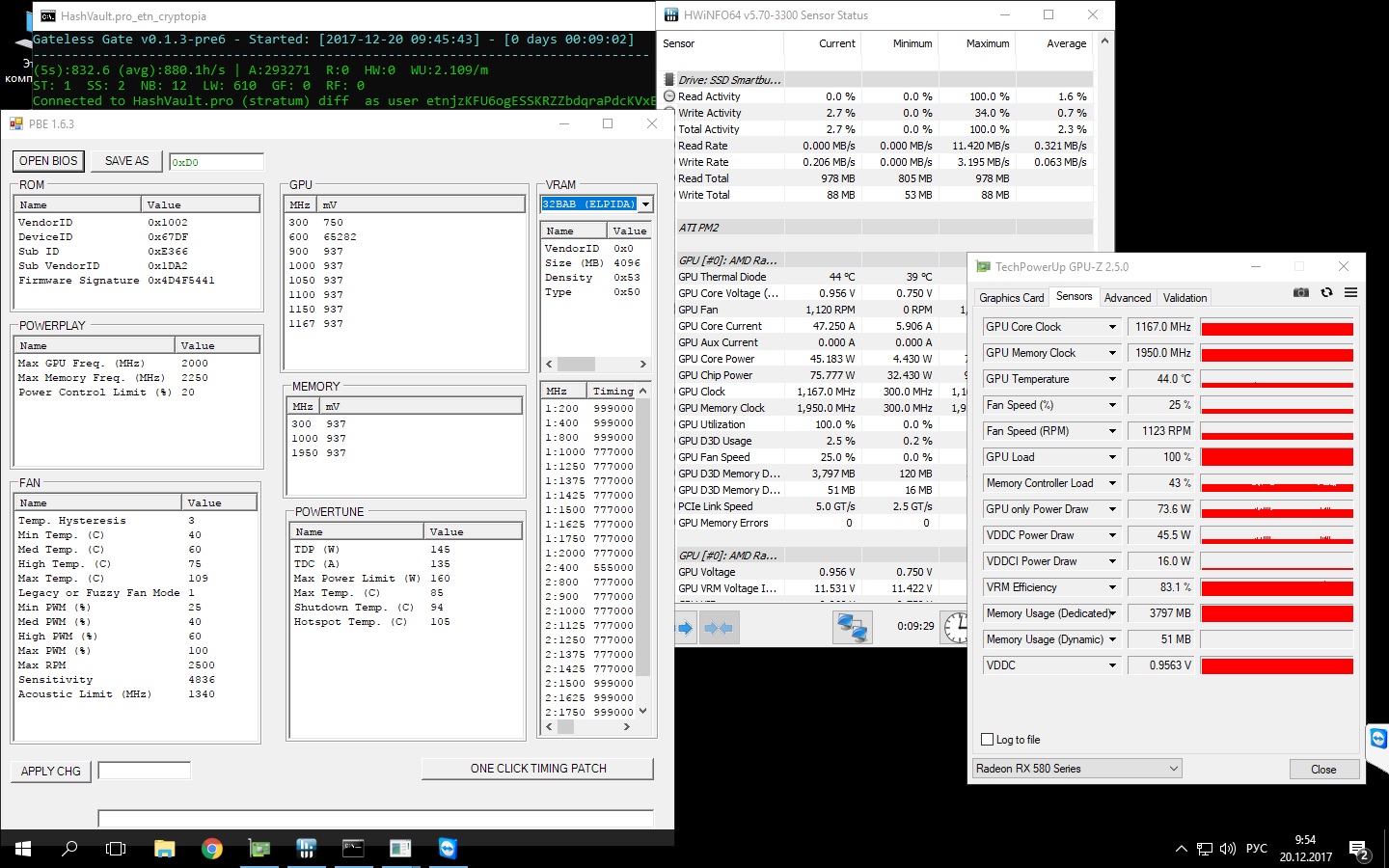 Парни, подскажите куда копать.. карта Sapphire Nitro+ RX580 4Gb, память - eplida. Цель - сделать даунвольт через биос. Прописал нужные частоты, указал везде напряжение 937mv, прошил, снес дрова через DDU, установил блокчейн драйвер, пропатчил, никакие настройки не трогал - и смотрю, что в процессе работы напряжение не 0.937, а скачет от 0.95 до 0.9625 почему? как опустить напряжение? и можно ли трогать напряжение в графе Memory - 300Mhz или оставить по дефолту 1000?