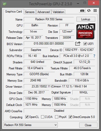 DeathBringer да - на скриншоте конкретно SAPPHIRE Pulse RX 550 2gb (11268-16-20G). На счёт Лёхи с 640 я ничего не знаю, а вот Баффин с 640 у меня на руках. И как-то мало по этому поводу инфы в интернете, на самом то деле. Обзорщики вообще стороной как-то обходят эти замечательные карты