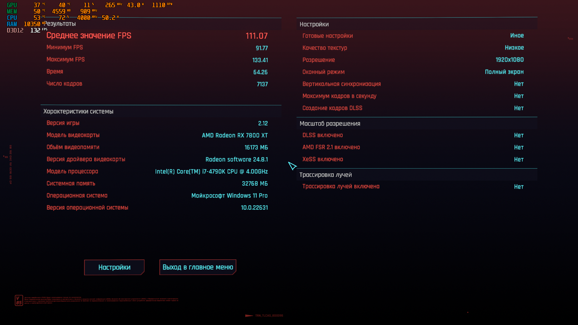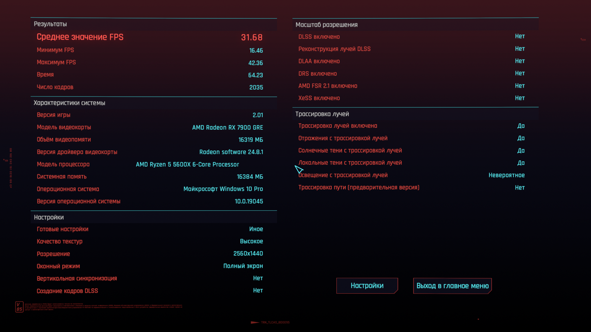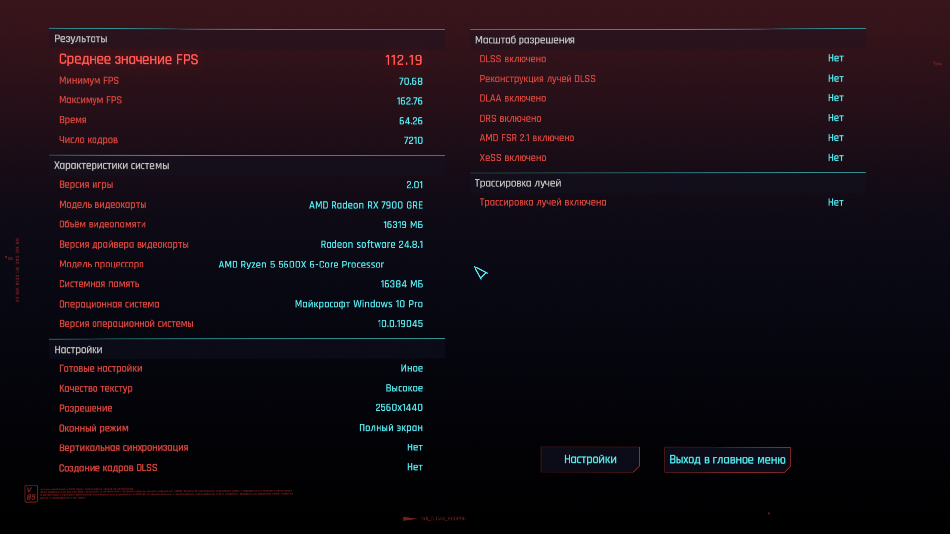 выше под спойлером как раз рассуждал о некоторых нюансах осмелюсь уточнить, у вас же вроде тоже 7800хт, не могли указать точные графические настройки в киберпанке, на которых у вас почти 100фпс. попробую повторить