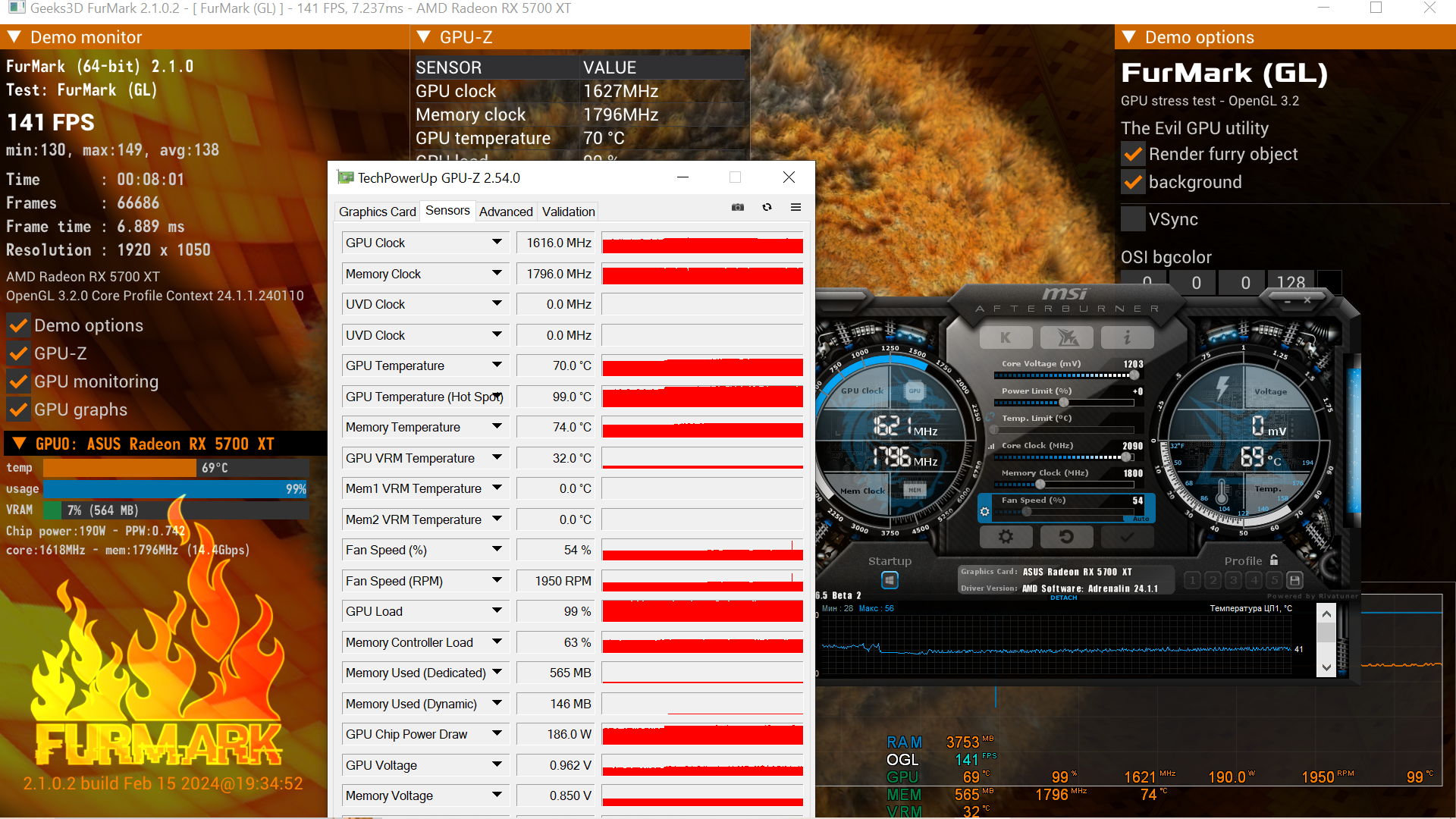 итак пока стоит нави заснял её показания в районе 5ти минут фурмарка на сток биосе, в режиме -15% повер лимит (это 160-170вт) и в штатном по биосу 190вт, так же заснял температуры в ингейме около часа в рдр2. Фурмарк тупо греет память, но при этом не бустит чип это так и должно быть или что то с картой? В играх же чип подымает частоту в район 2050мгц. Термотрубки все проверил отключив кулера все чуть теплые.