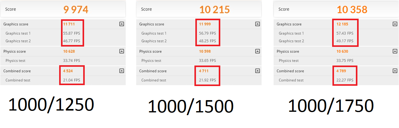 _NooB_ Оценка 9737 Оценка графики 11330 Оценка физики 11430 Тест графики 1 53,58 Тест графики 2 45,59 Тест физики 36,29 Комбинированный тест 19,90 Биос оригинальный, частоты 1000, 1250, 3DMark 2013 Fire Strike обычный
