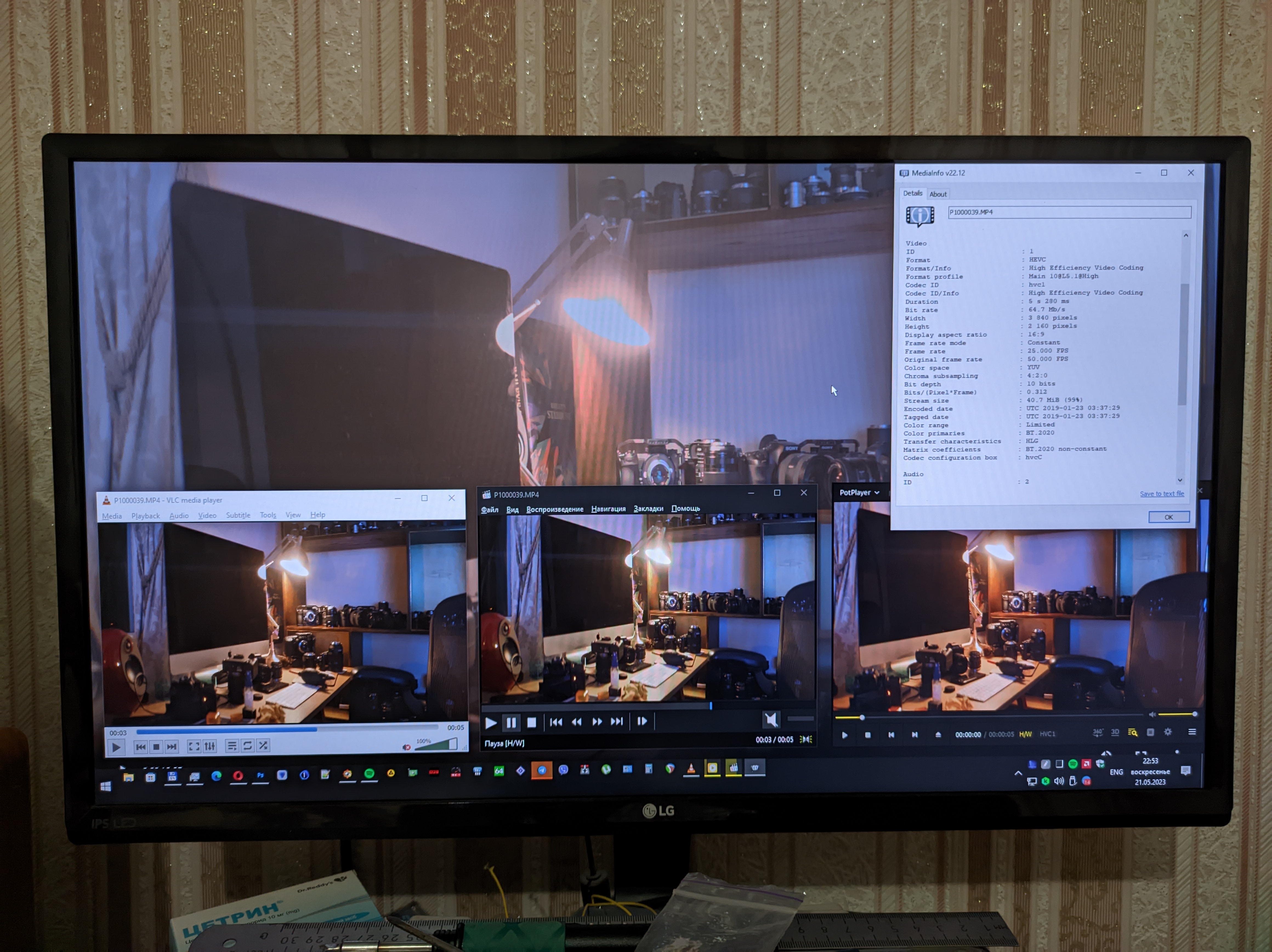 Заморочился, скачал файл на 10бит, открыл в трех разных плеерах и в нагрузку еще в опере...сделал и скриншот и фото, чтобы было понятно что в системе, а что видно глазами, напомню монитор 6bit + FRC.