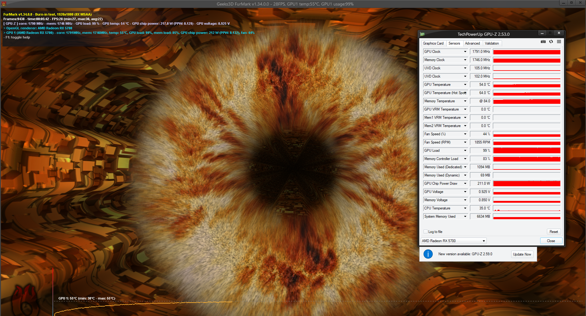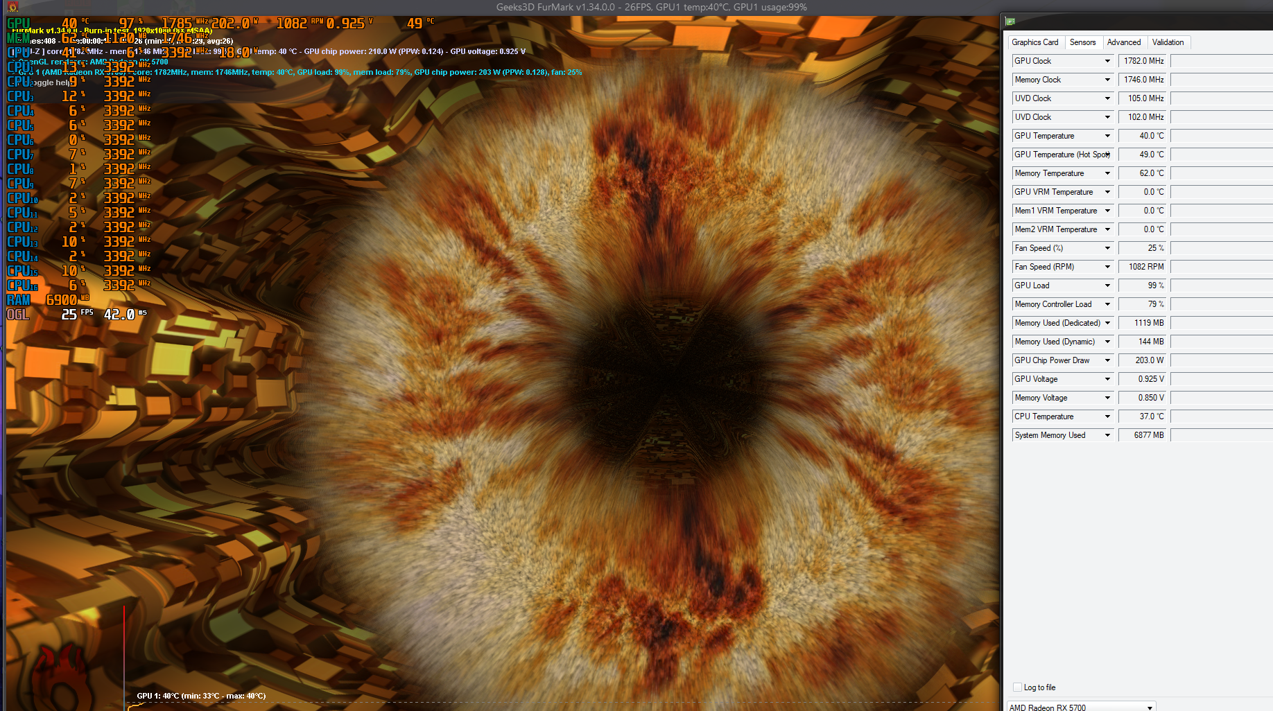 покажи фурмарк 1080 8х + гпуз на все датчики в одном окне