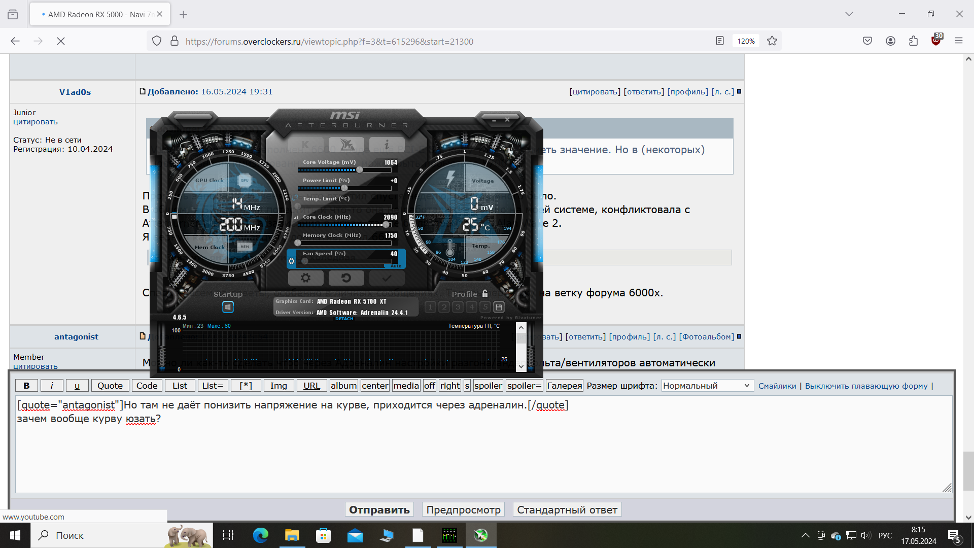 Профиль заполнил. Извеняюсь что ответил спустя неделю, работы много было. В общем, я 5700ю взял потестить и что-то она не работала стабильно на моей системе, конфликтовала с Afterburner и вызывала зависания в играх, также были проблемы с Alan Wake 2. Я вернул карту продавцу и, доплатив, взял 6600.