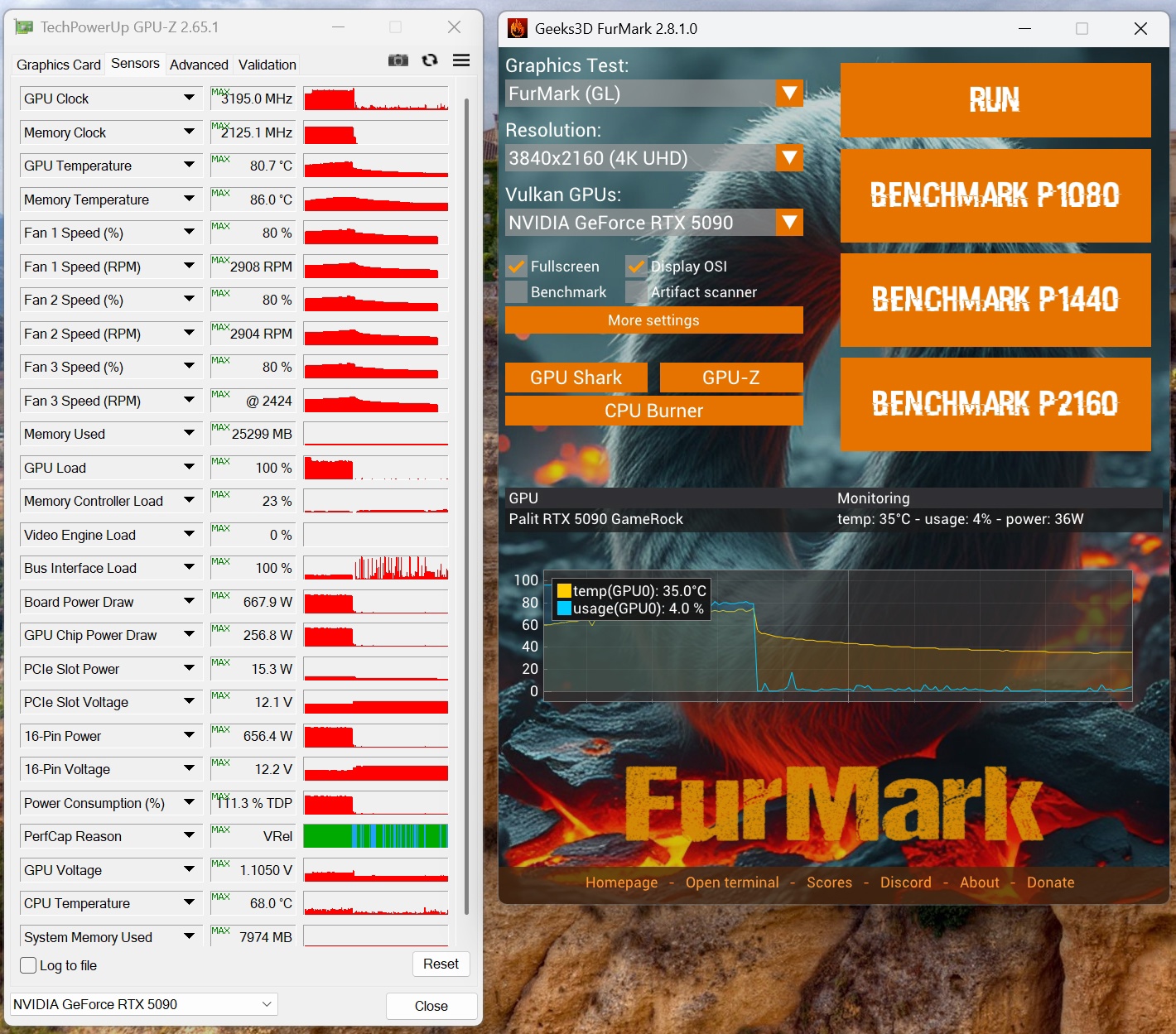 Palit GameRock 5090 OC, стоковое охлаждение.