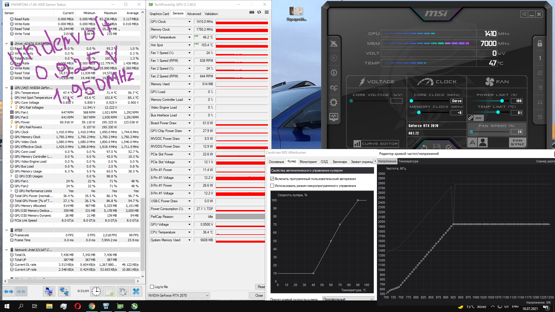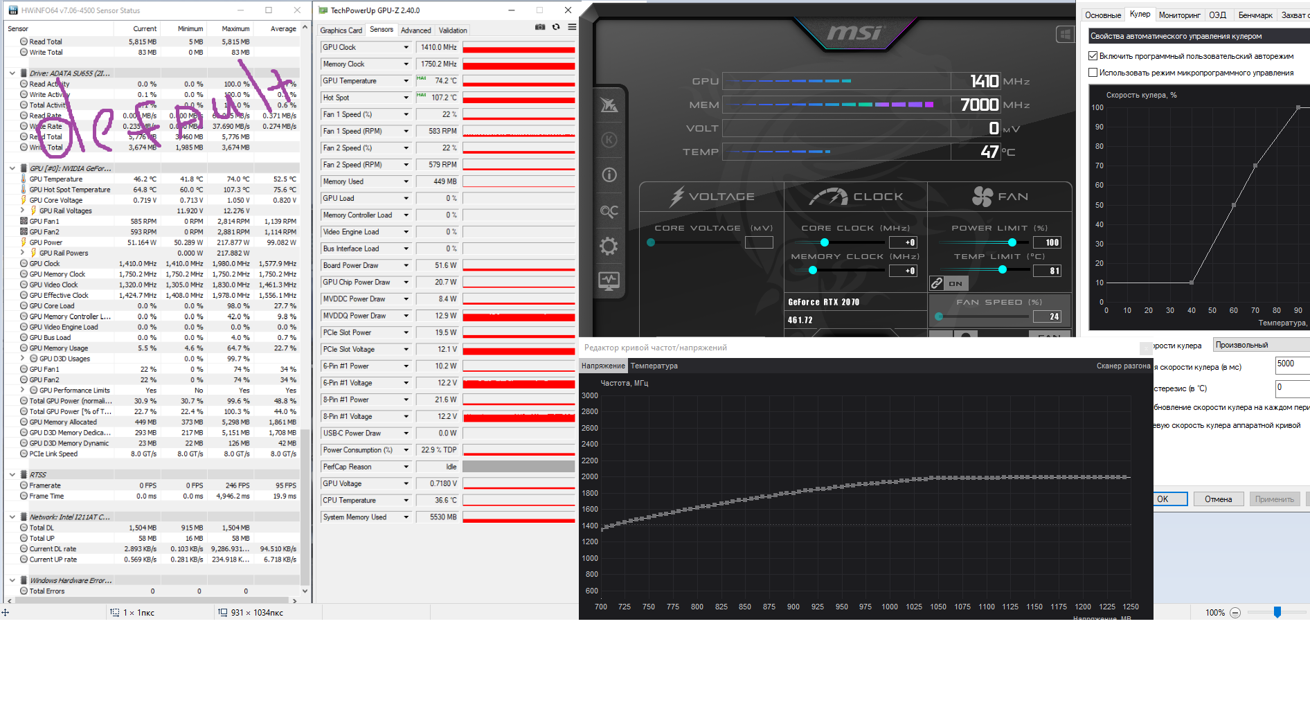 Доброго времени суток. Видеокарта rtx 2070 msi gaming z. Столкнулся с проблемой очень высокой температуры через hwinfo64 и gpu-z "hot spot" 107С в пике разового (пубг и фурмарк), при температуре gpu не выше 71С. (скриншноты прикрепил) За температурой gpu слешу практически с момента приобретения, не было такого чтобы она поднималась выше 75С, за два с лишним года использования видеокарты майнинг не видела, и жестких игр практически тоже т.к играю в основном в онлайн шутеры (кс, пубг, варзон, ведьмак 3 раньше играл). Единственная проблема которая раньше беспокоила это глюк с кулерами, температура 73-74С, кулера начинали резко молотить на максимум, температура падала затихали и через несколько минут опять по новой, при чем кривую кулеров настраивал практически сразу после покупки, помог андервольтинг, о котором я узнал к сожалению только через пару лет. Я так понимаю это проблема на rtx встречалась не только на мсайках. Не знаю как давно видеокарта греется до таких температур по "hot spot" заметил это недавно. За все время использования видеокарты артефактов, ошибок по gpu и прочих моментов не было, на прикреп. скриншоте из hwinfo64 видно, что на высокой температуре видеокарта начинает скидывать частоту. Гарантия до декабря 2021г., есть ли смысл нести в магазин по гарантии или пошлют куда подальше? Или же только вариант с заменой термопрокладок и термопасты на чипе?! И как подобрать той же толщины и жесткости термопрокладки, чтобы не получилось еще хуже по температуре после их замены.)