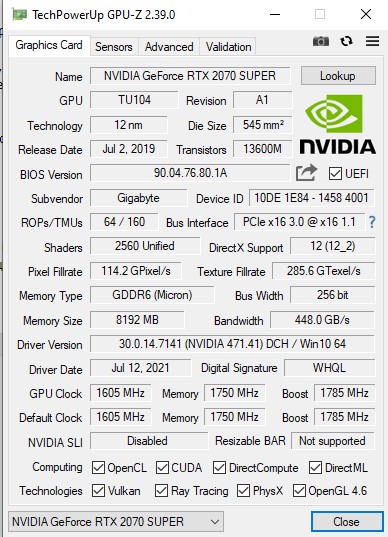 Конфиг: Ryzen 7 3700X, Asus Prime A320M-K, 32GB RAM 3200MHz, GIGABYTE GeForce RTX 2070 SUPER WINDFORCE OC 3X 8G, БП Cooler Master G750M 750W, драйвер 471.41. Очень надеюсь на вашу помощь