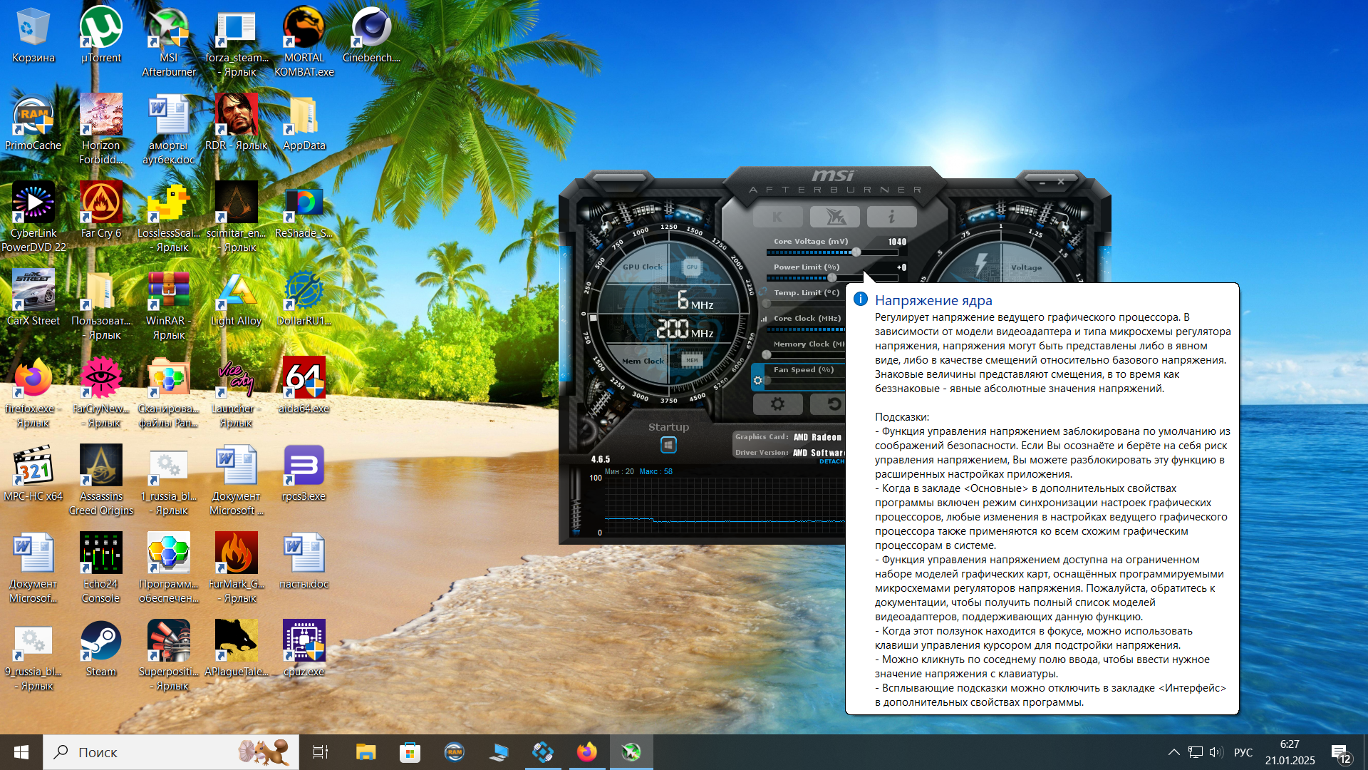 какая курва ты издеваешься , регулируй нормально напряжение это же не нвидиа. Снижай вольтаж в район 10 +. Частоты пробуй штатные, если будет виснуть чуть снижай, курва это очень кривой во всех смыслах инструмент сделанный для нвидиа лучше его не пользовать. Регулятор напряжения включается отдельно в афтебернере. В идеале вам нужно со 180вт спустится в 150 - и там уже смотреть какие температуры.