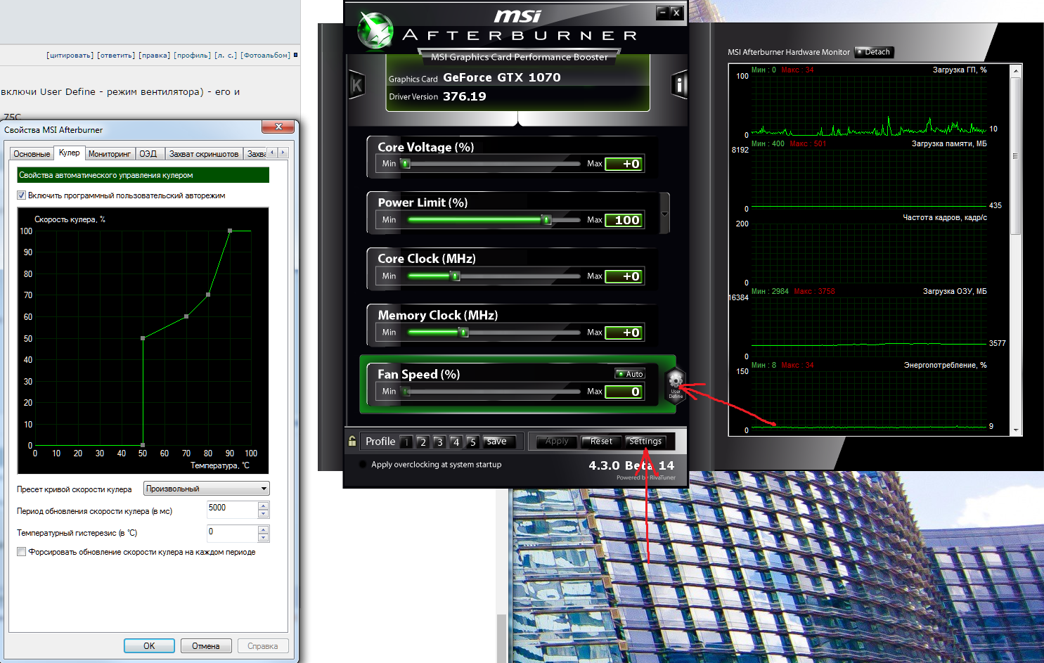 В MSI AB в настроках есть закладка "кулер". В ней отображается график зависимости оборотов от температуры (предварительно в главном меню включи User Define - режим вентилятора) - его и редактируй. Вообще, когда у меня был реф 980Ти я просто вручную фиксировал обороты на 75%. В итоге и разгон нормальный, и температура не превышала 75С