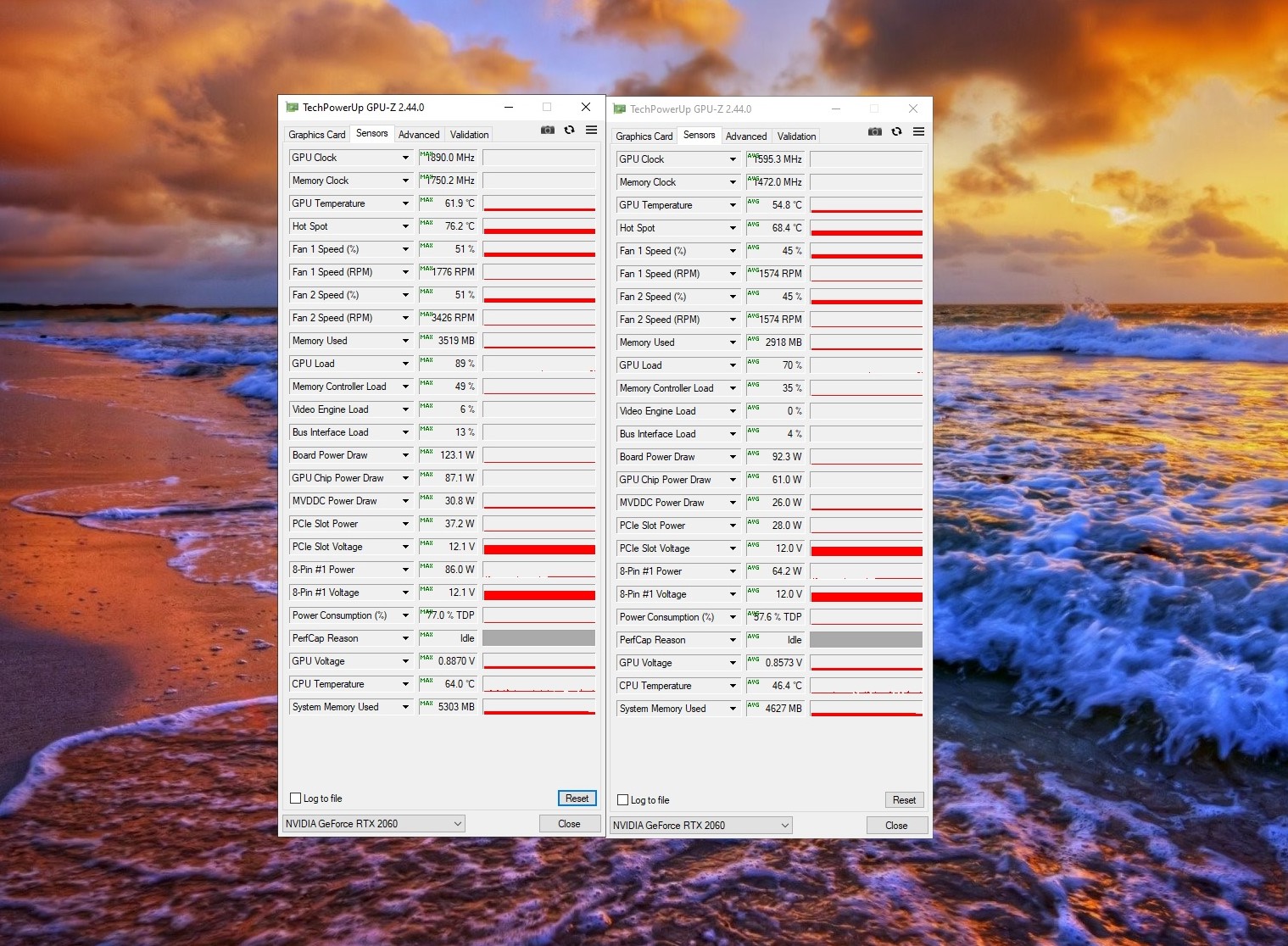 SergeiBM, вентиляторы при этом в авто? СО видеокарты с завода, как правило, настроена на поддержание некой оптимальной температуры. После даунвольта температуры, в автоматическом режиме, могут быть примерно такими же, но обороты вентилятора будут ниже, соответственно меньше шума и износа. По вашему скриншоту ничего не понятного: на одном, в GPU-Z, максимальные значения, на другом средние. Для более корректного и наглядного сравнения, нужны одинаковые условия: в обоих случаях корпус должен быть либо закрыт, либо открыт и обороты вентиляторов должны быть одинаковые.